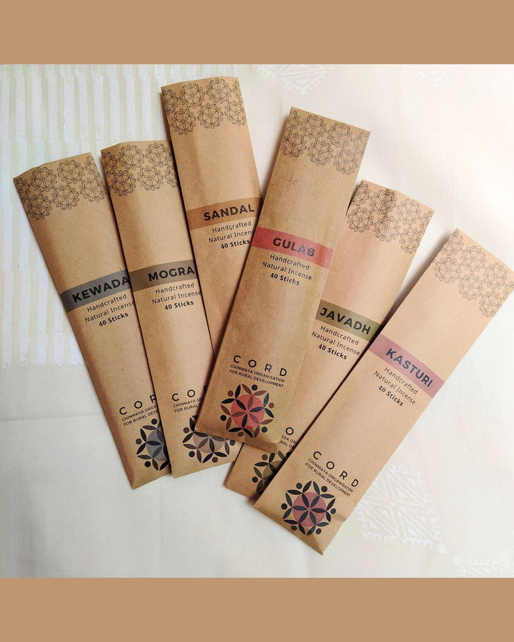 Infuse your space with the subtle charm of tradition and tranquility. These handmade natural incense sticks (agarbattis) are lovingly crafted by rural women of the Gurudhara Self-Help Group, supported by CORD (Chinmaya Organisation for Rural Development) in Siruvani, Tamil Nadu.