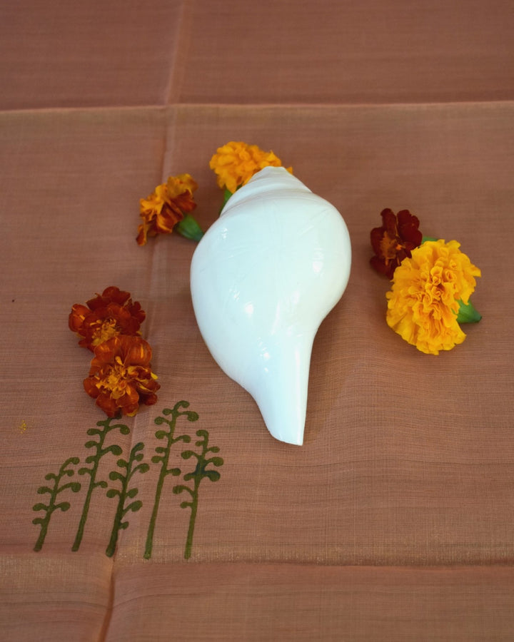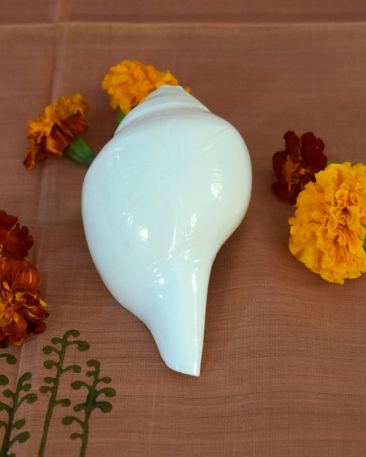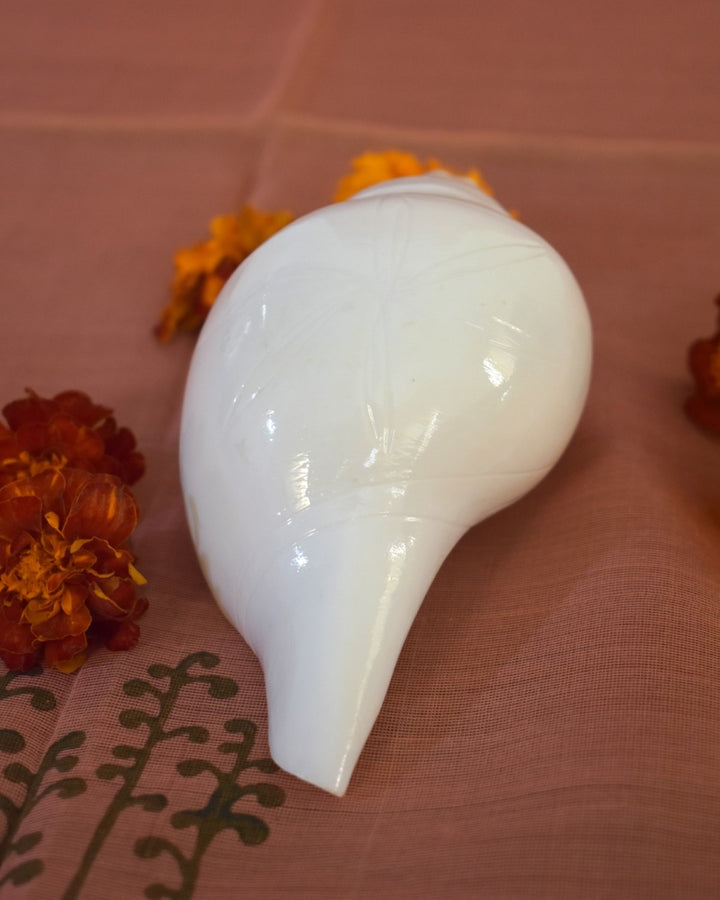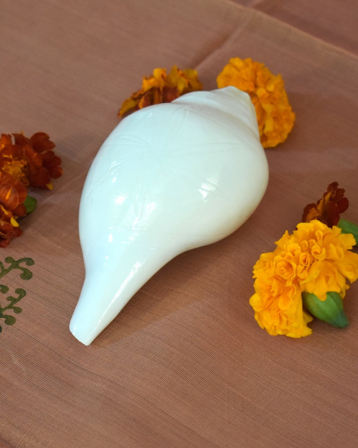 The auspicious sound of the Conch creates a positive vibe in the atmosphere or the minds of the worshippers, elevating it to a prayerful attitude even in the midst of a busy daily routine. An age-old tradition, it is still used in temples and after all the important pujas or ceremonies and on sacred occasions. The blowing of a conch shell enhances the positive psychological vibrations such as courage, determination, hope, optimism, willpower and bliss can be felt by all people assembled and also by the blower.