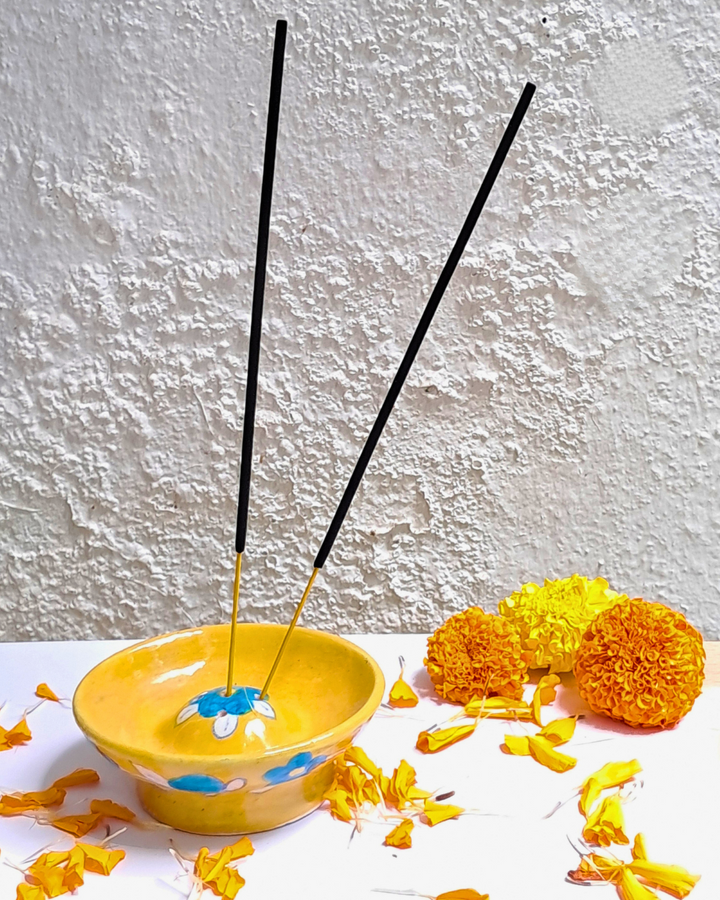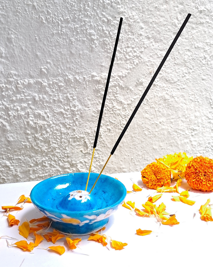 Elevate your daily rituals with our handcrafted Blue Pottery Agarbatti Holders, each one a beautiful fusion of function and tradition. Made using the traditional craft of Blue Pottery, these holders are adorned with vibrant floral designs and glazed to perfection. The raised dome center features multiple holes, allowing you to hold 1–5 incense sticks at once.