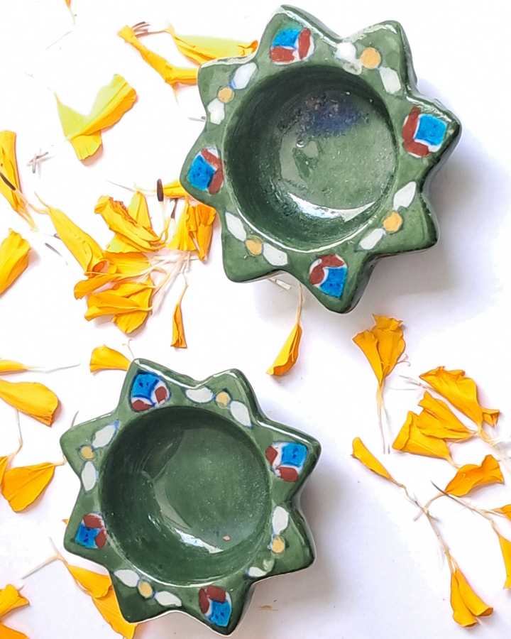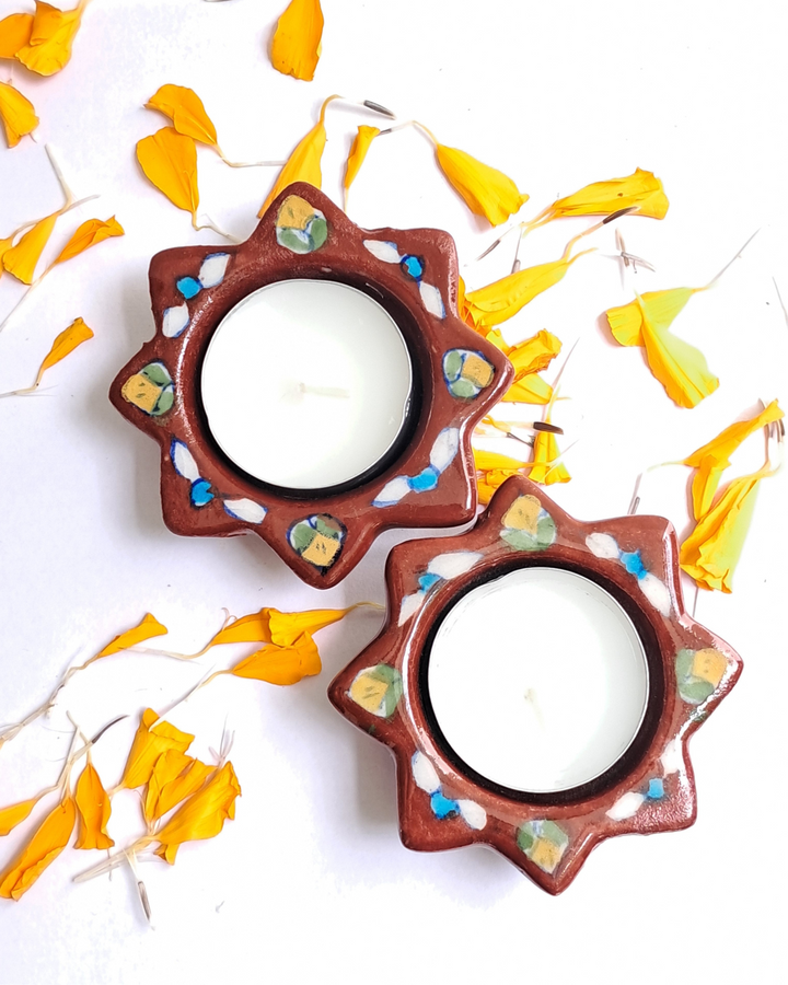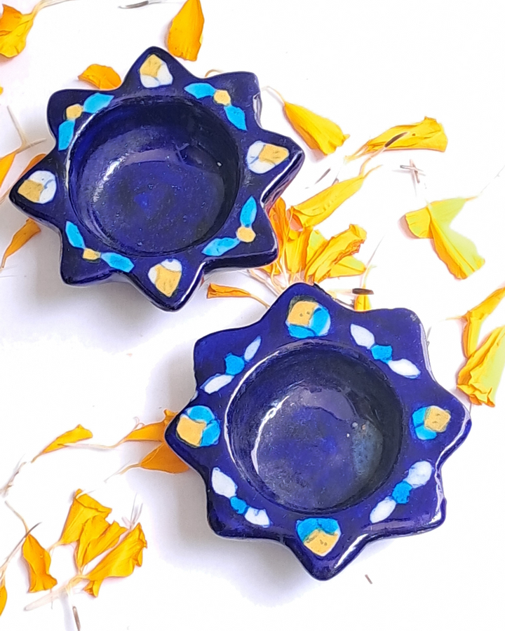 Brighten your space with the charm of tradition and craftsmanship. These beautiful star-shaped tealight holders are made using the time-honored art of Blue Pottery. Each piece is hand-painted with intricate floral motifs and glazed for a smooth, glossy finish.