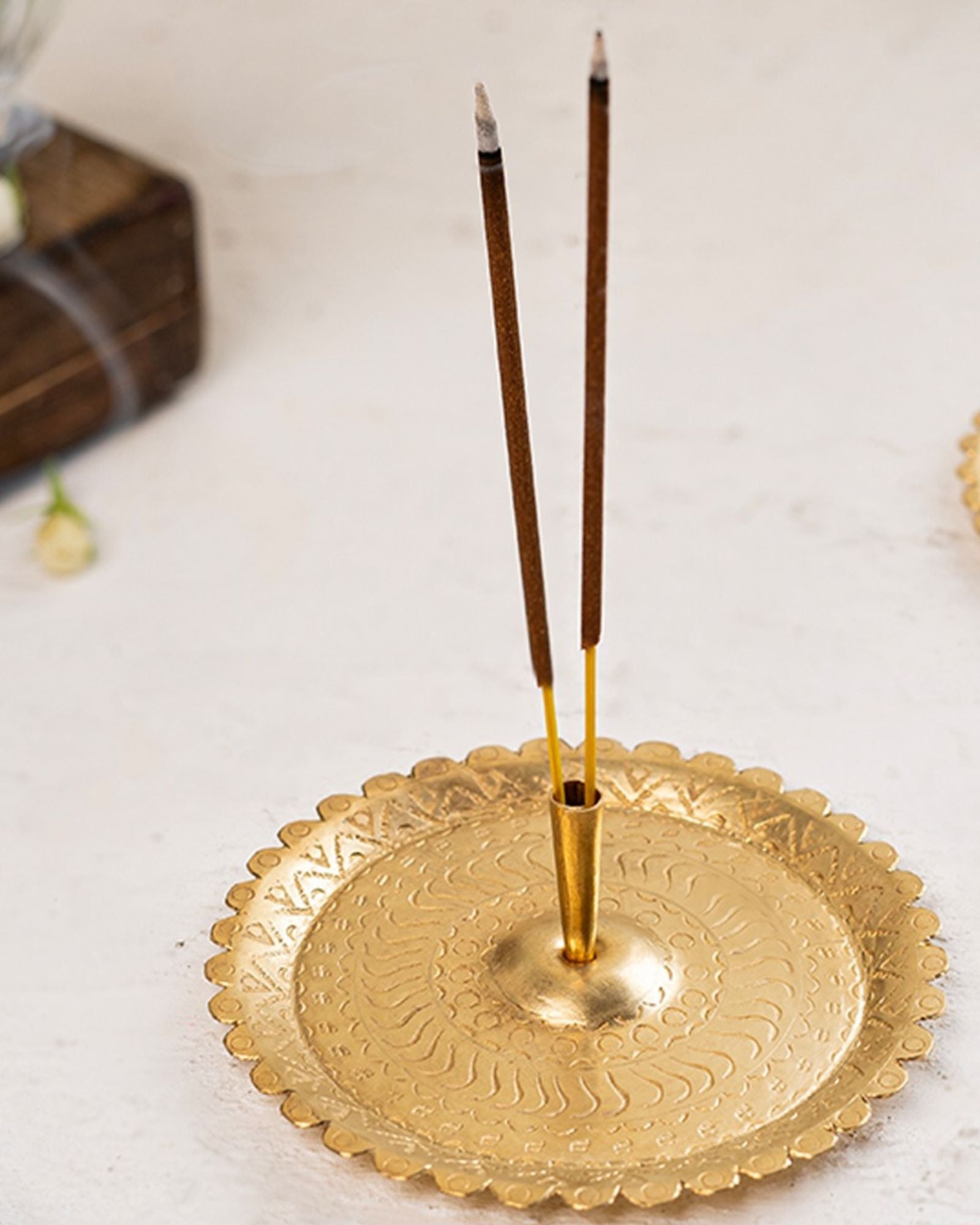 Thoughtfully designed to catch incense ash within the base, it keeps your surroundings clean while enhancing the ambience with its rich golden sheen. Ideal for use in puja rooms, meditation spaces, or as a meaningful gift.