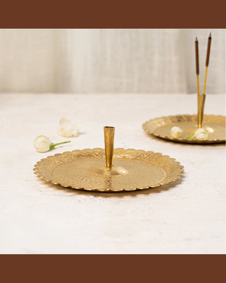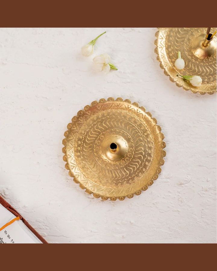 Elevate your rituals with the Ripple Brass Incense Holder, a finely handcrafted piece made from high-quality brass metal sheet by skilled artisans in Western India. Featuring a ripple-inspired design and intricate surface etching, this holder adds both calm and character to your sacred space.