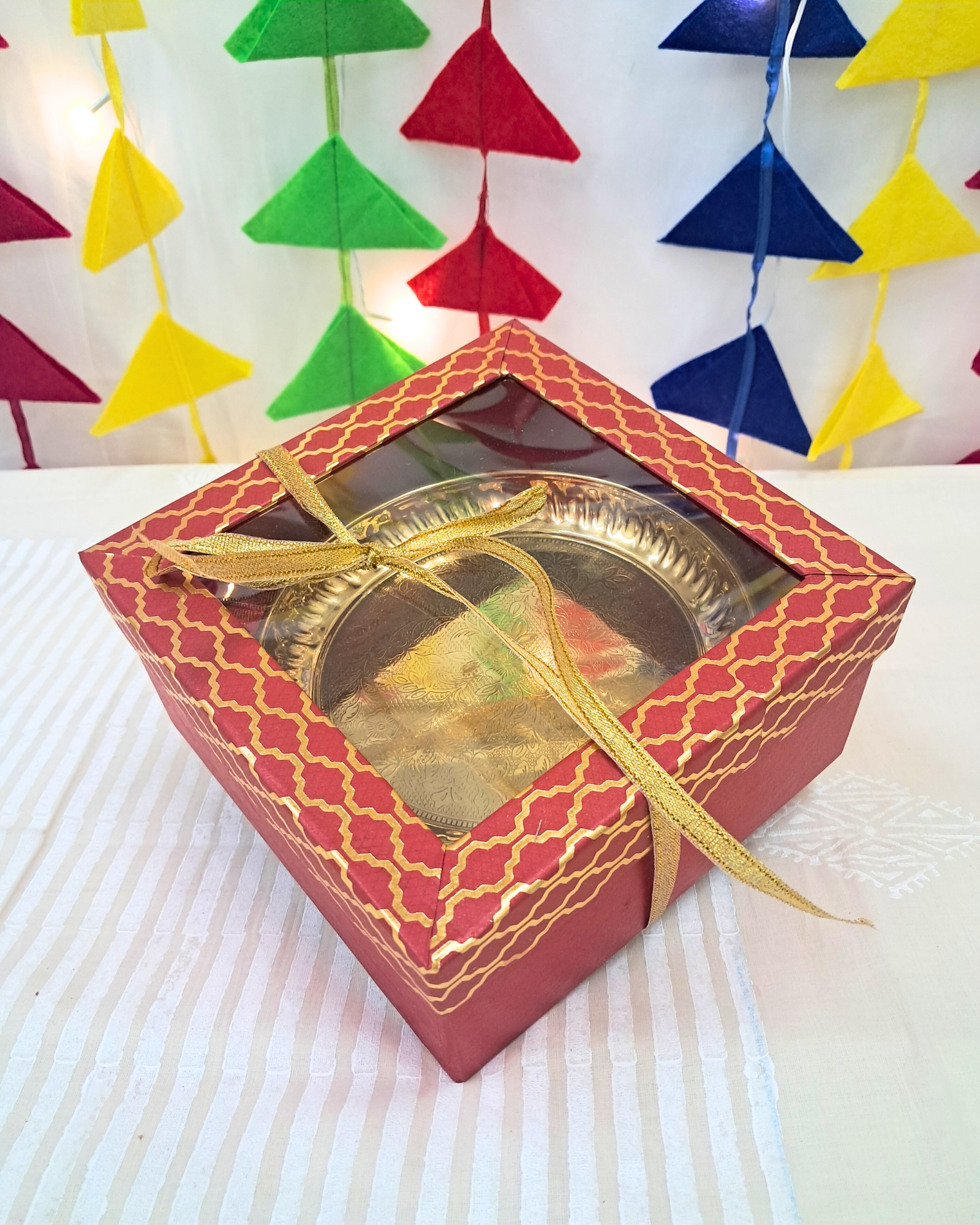 The Pavitra Gift Box is a complete puja essential set, beautifully crafted in pure brass and presented in a festive red-and-gold box. Inside lies a finely detailed brass puja thali along with traditional accompaniments like a bell, spoon, and katori bowls. Together, they form a set that is both functional and deeply symbolic, perfect for daily rituals as well as festive celebrations.