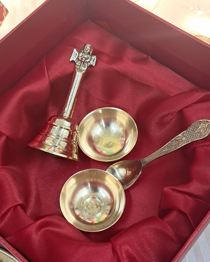 Contents: Brass Puja Thali Set (Thali, Bell, Spoon, 2 Bowls)