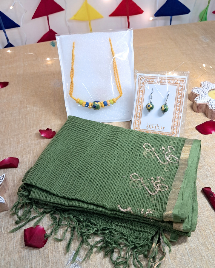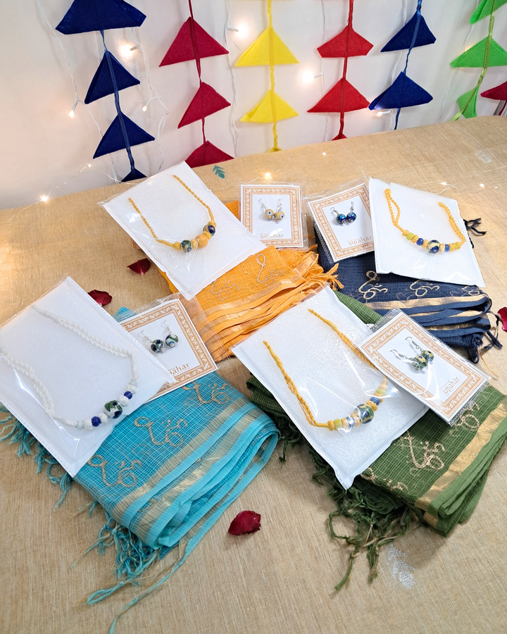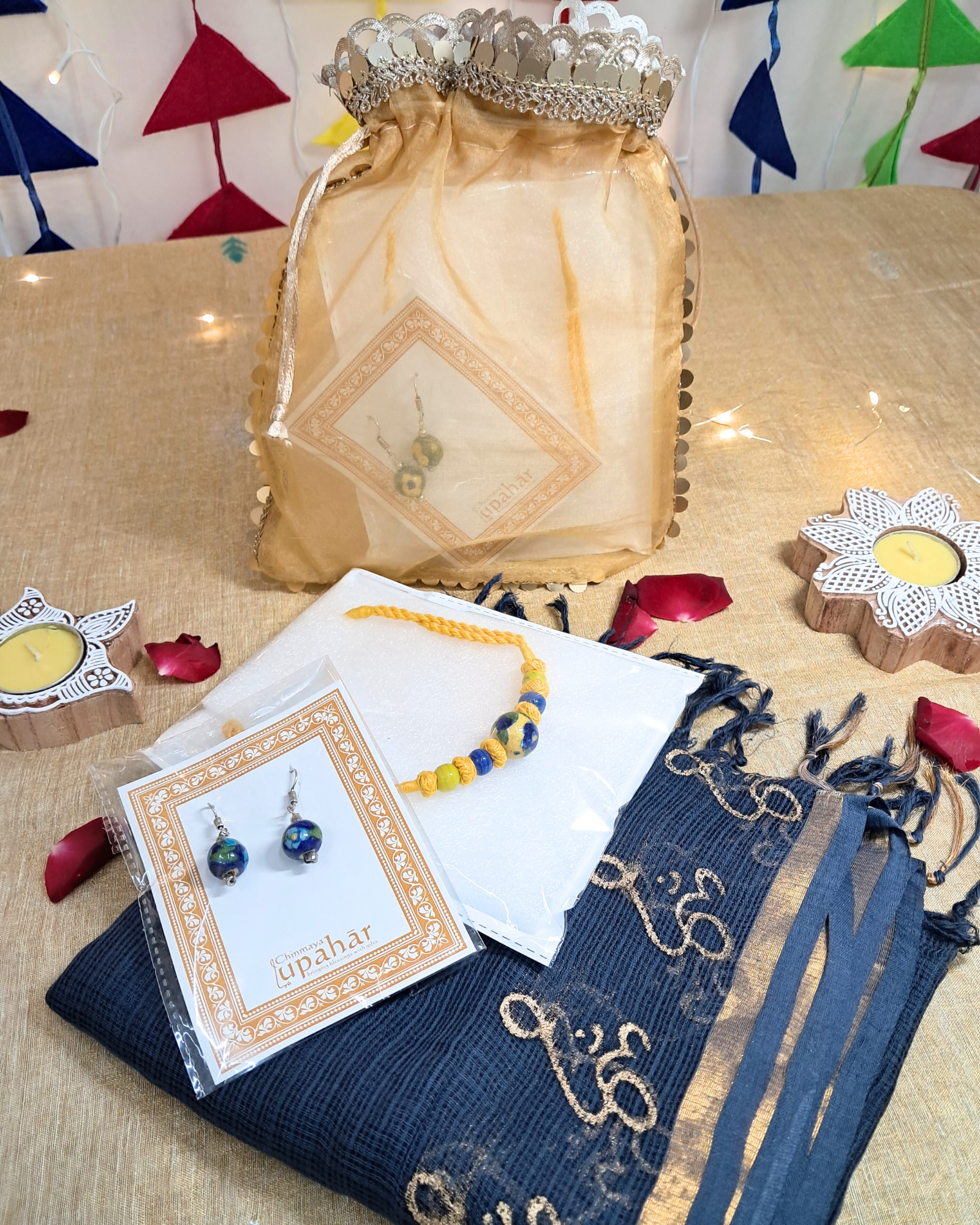 The Shringar Gift Pack is a graceful blend of tradition, artistry, and elegance—perfectly curated for women who cherish timeless beauty. With handcrafted blue pottery jewelry and a soft Kota dupatta adorned with golden Om motifs, this set makes for a meaningful and stylish present. Ideal for festive occasions, birthdays, or thoughtful gestures, Shringar reflects charm, devotion, and sophistication in every detail.