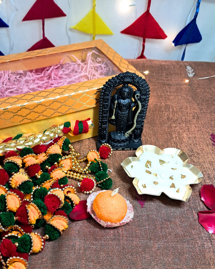 Contents: 1 Ayodhya Rama Idol (4.5"), 1 Lotus Urli Candle (4.5"), 1 Wool Toran, 1 Laddoo Candle.