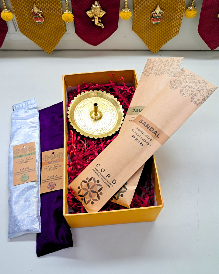 Elevate your festive gifting with this Ripple Brass Incense Holder paired with four packs of natural handcrafted agarbattis made by rural women of CORD Siruvani. The brass incense holder, with its elegant ripple design, adds a touch of sophistication to daily puja rituals or meditation spaces, while the eco-friendly agarbattis bring in calming, natural fragrances.