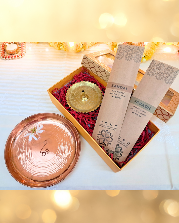 Diwali Gift Box - Copper Thali, Brass Incense Holder with 2 Packs of Natural Agarbattis
