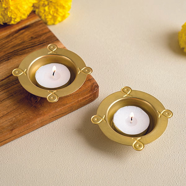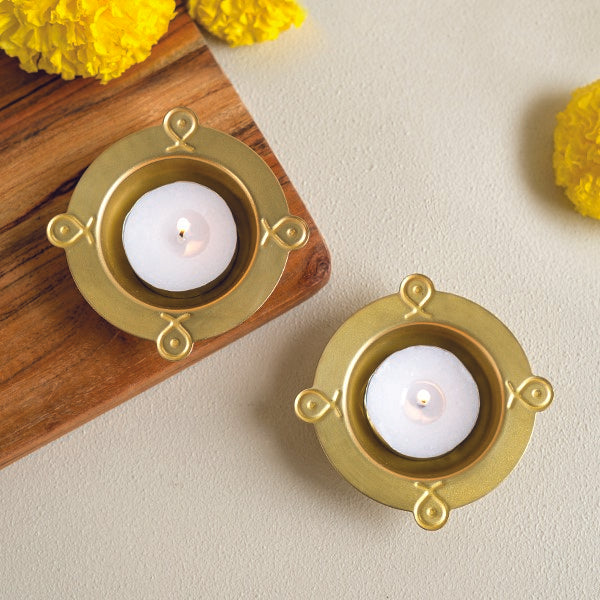 Set of 2 brass tealights, handcrafted with Rangoli-inspired patterns
