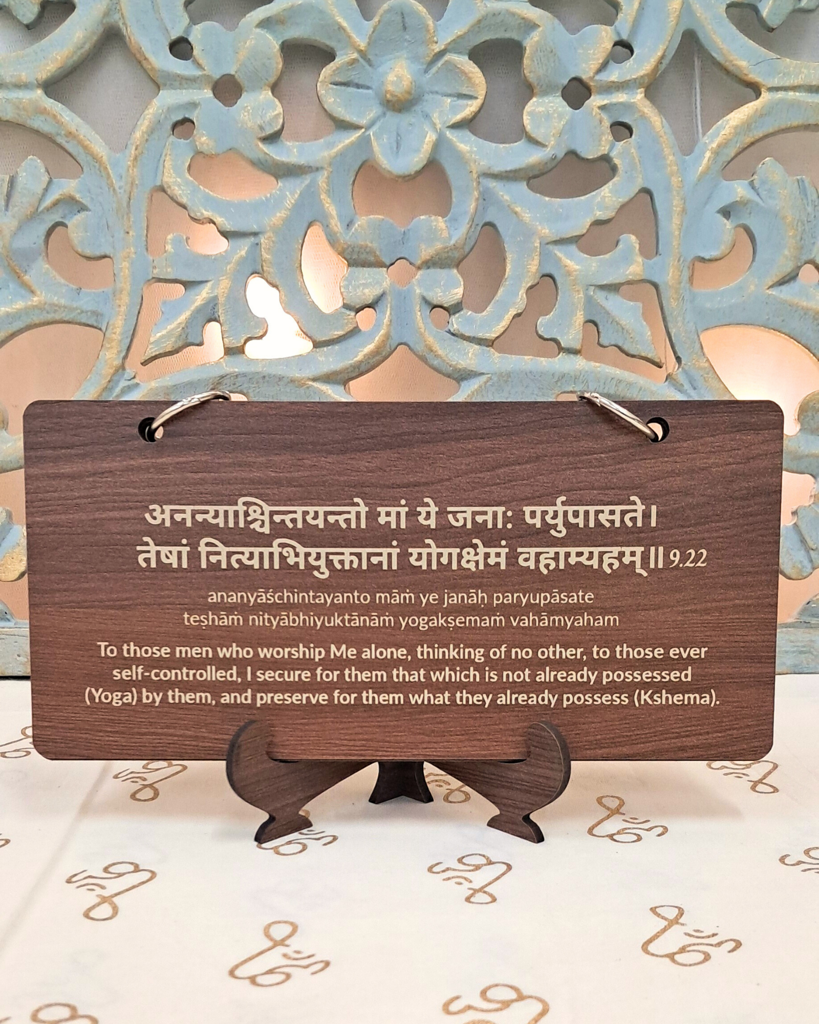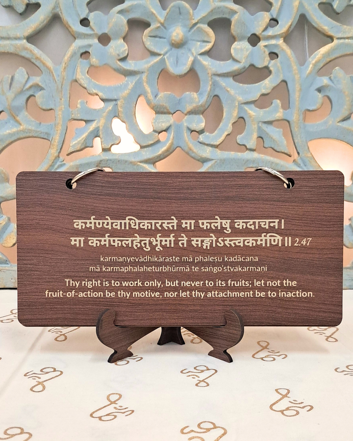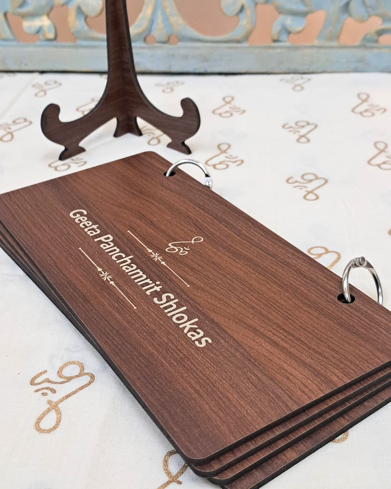 Each sheet is laser-engraved with the Sanskrit shloka, transliteration, and English meaning—based on Swami Chinmayananda’s commentary—making it a durable, aesthetic, and spiritually uplifting display. The compact 3 × 7 inch sheets come with a foldable wooden stand, allowing you to flip through the verses easily.