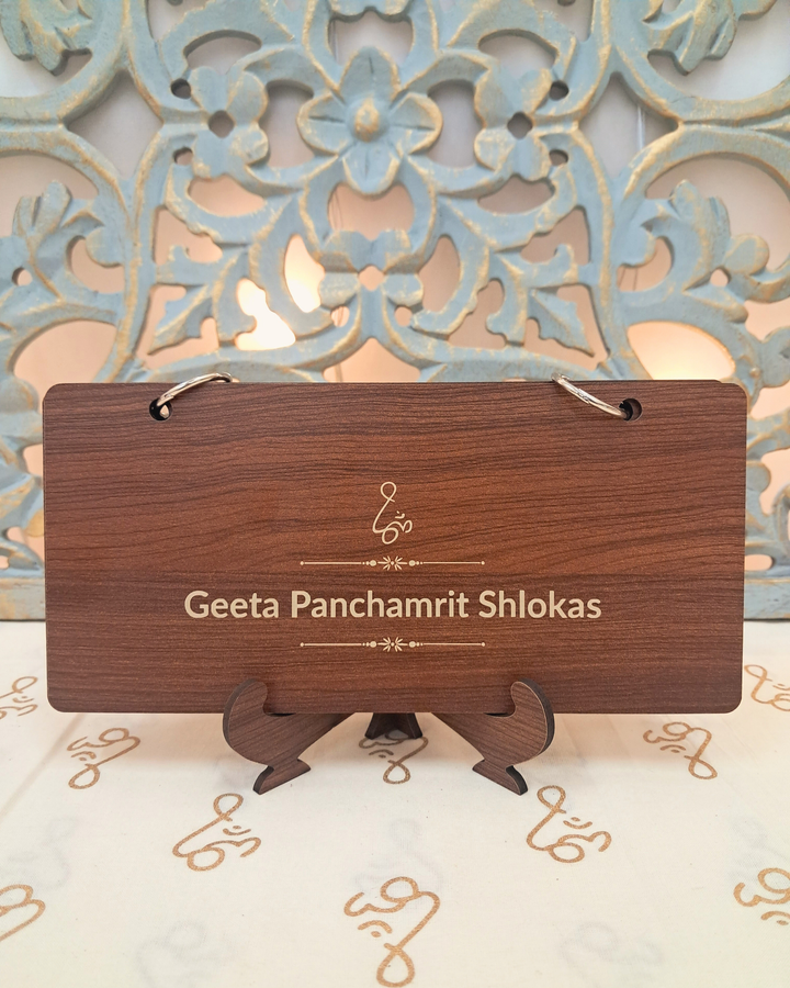 Celebrate the 75-year legacy of Chinmaya Mission with this beautifully crafted engraved wooden Panchamrit Shloka Set. Featuring all five Panchamrit shlokas across four premium wooden sheets, this tabletop piece brings the timeless teachings of the Bhagavad Geeta into your daily space.