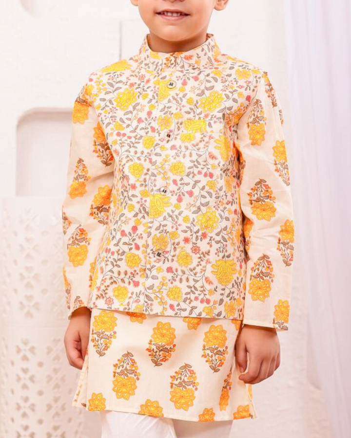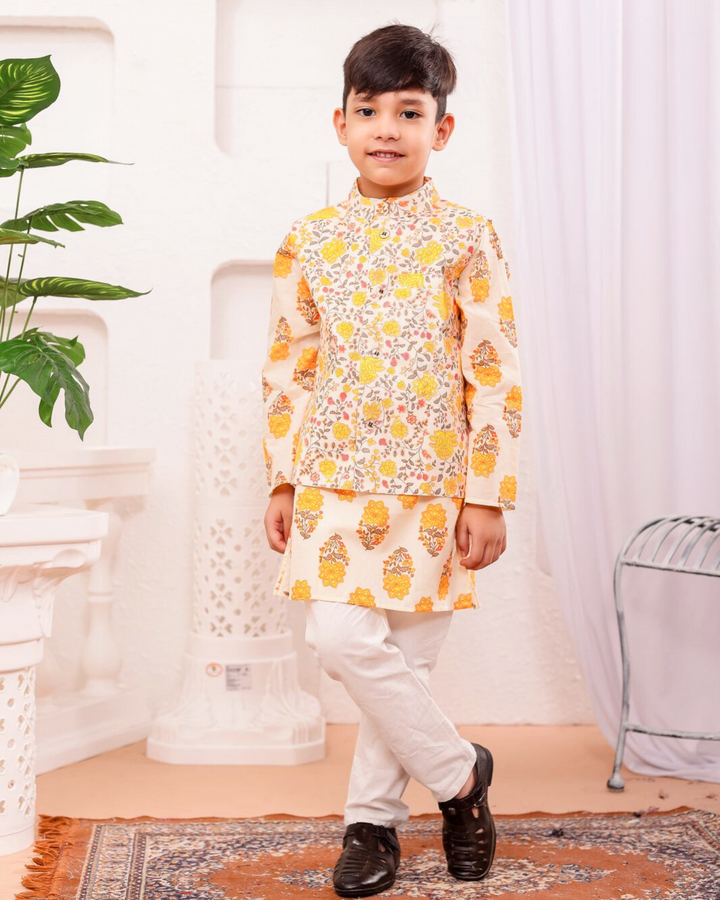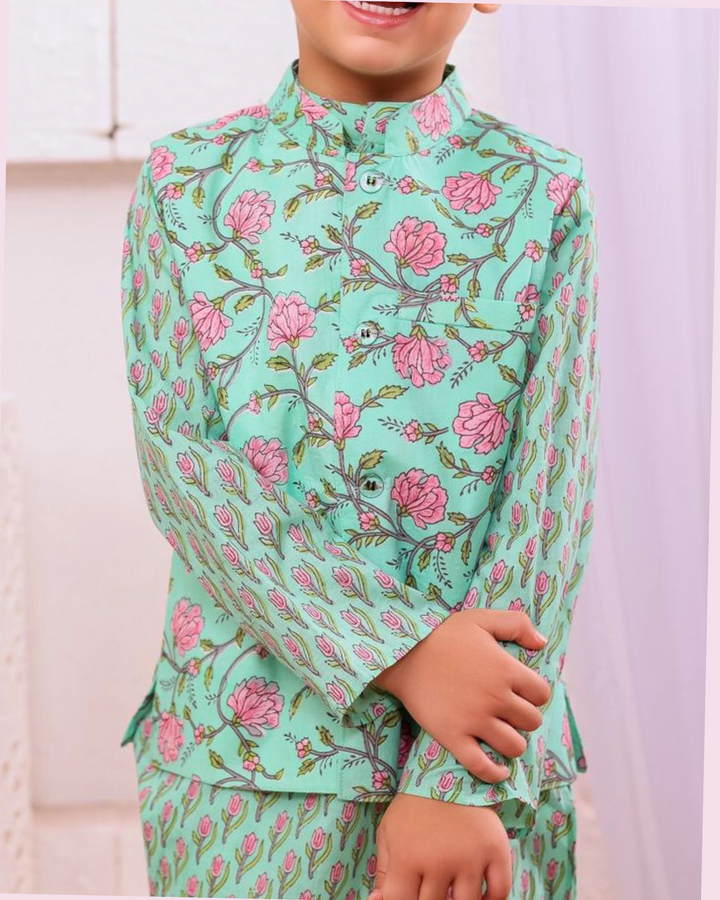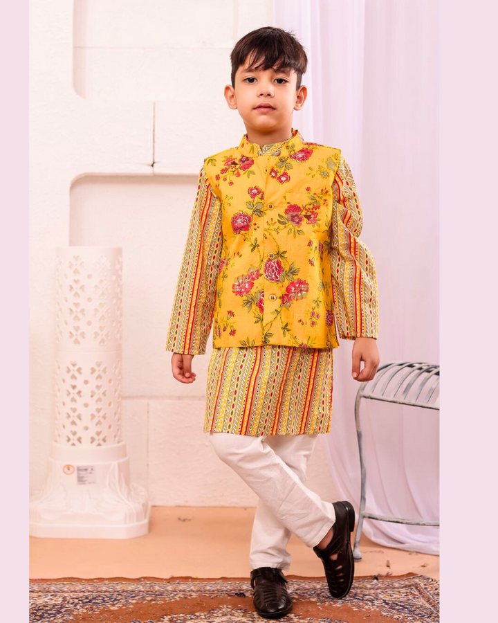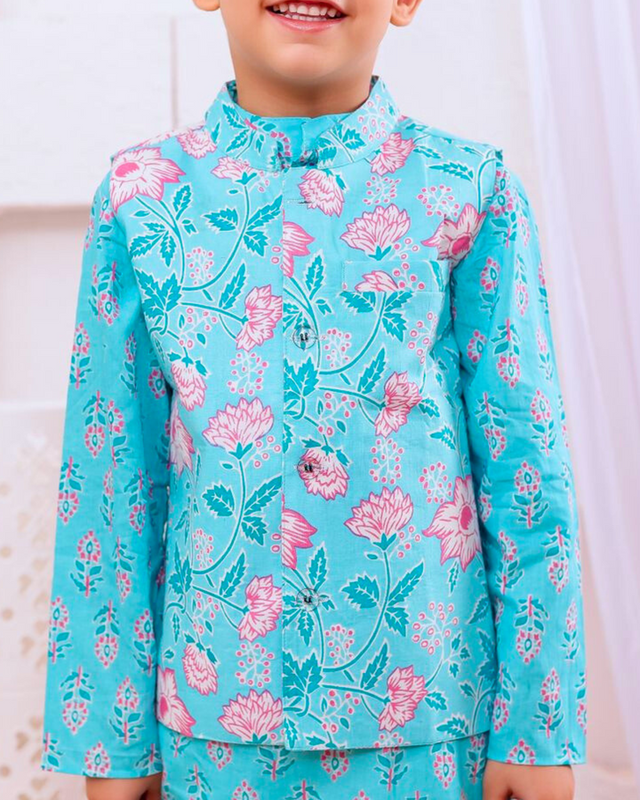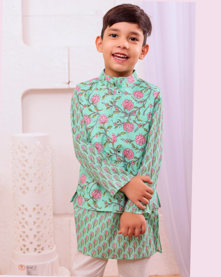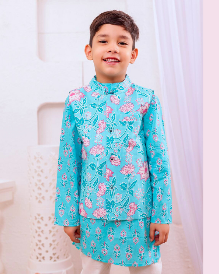 Celebrate festivities with our delightful pure cotton ethnic wear for boys. Thoughtfully crafted with vibrant traditional prints, these comfortable kurta and jacket sets offer the perfect blend of tradition, comfort, and contemporary style, ensuring your child feels confident and at ease throughout the day. Each set features intricate patterns inspired by our rich cultural heritage, highlighting meticulous attention to detail, making it a unique and timeless addition to your boy’s festive wardrobe. Specifically designed for special occasions like Raksha Bandhan, weddings, family gatherings, festivals, cultural events, and other joyful celebrations, these outfits ensure your little boy will shine brightly, stand out, and look his charming best, creating lasting impressions, memorable moments, and treasured photographs for years to come.