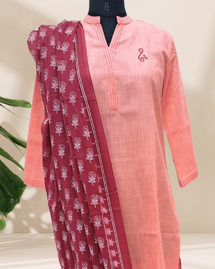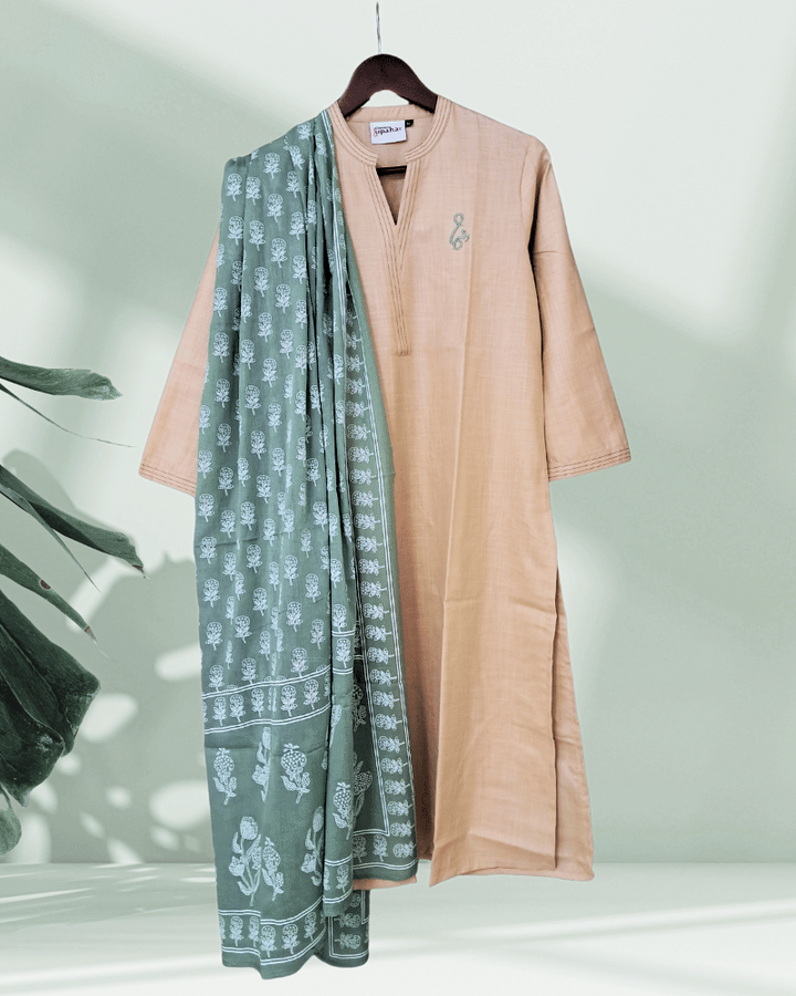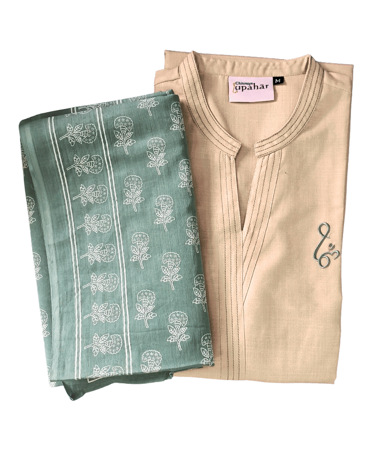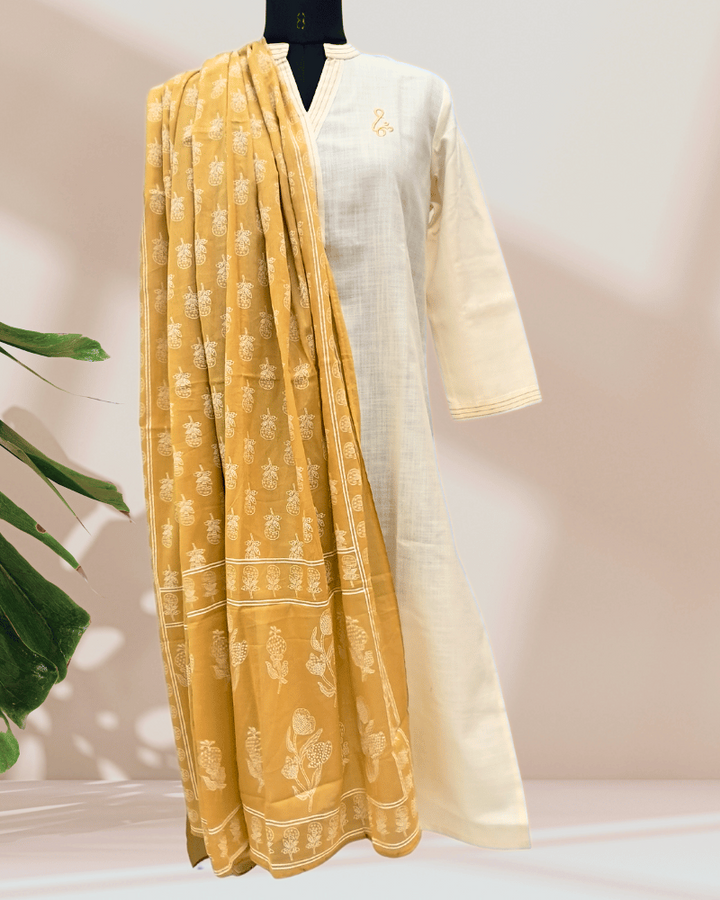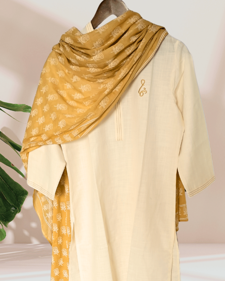 Discover timeless elegance with our women's long kurta and dupatta set – where comfort meets tradition. The kurta is made from breathable Matka Cotton, known for its slightly textured weave and natural sheen. It features subtle Om embroidery near the neckline, adding a sacred, spiritual touch.