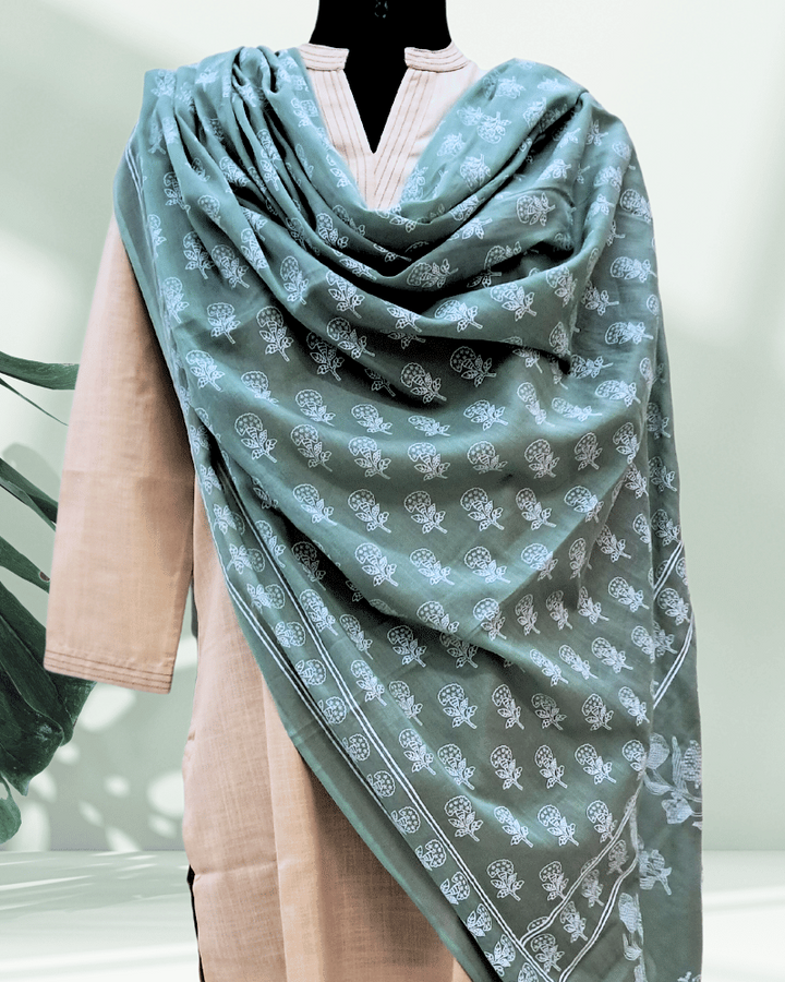 Paired with a contrasting pure cotton dupatta, hand-printed using the traditional discharge technique, this set makes an effortlessly graceful ensemble – perfect for festive occasions, spiritual gatherings, or everyday elegance.
