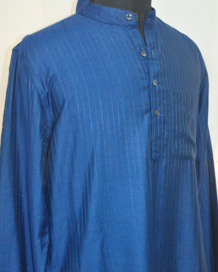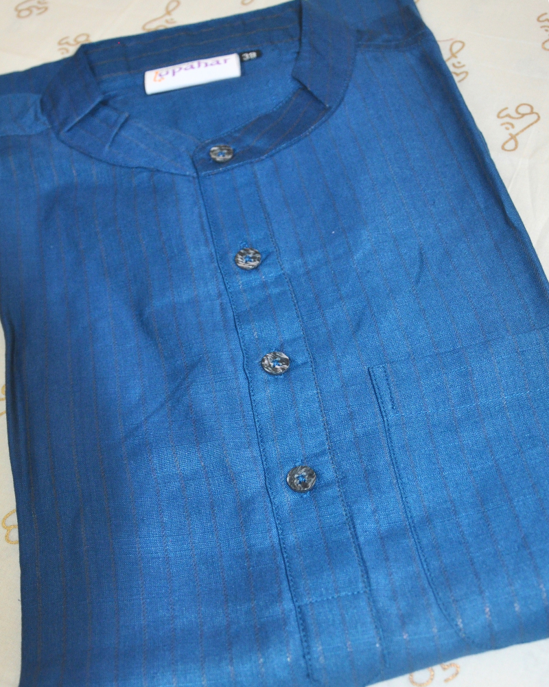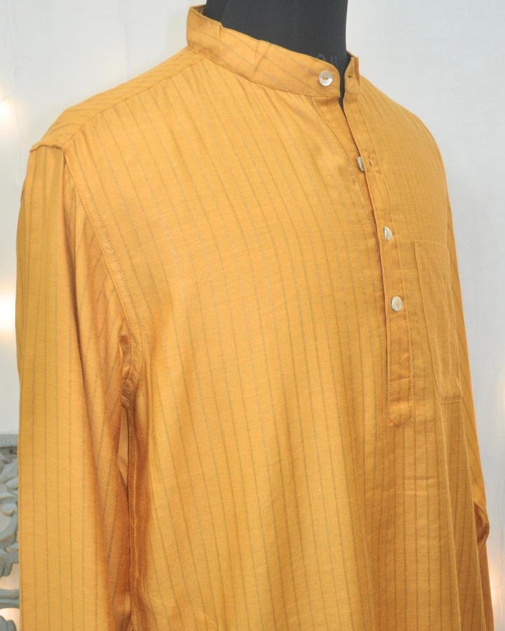 Men’s Silk Viscose Kurta with Woven Self-Stripes – Blue & Golden Mustard