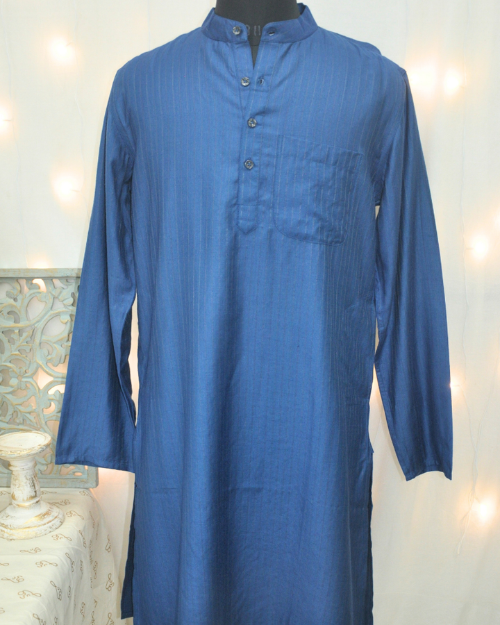 Crafted from a rich silk-viscose blend, this Men’s Kurta features subtle woven self-stripes that lend texture and depth to its smooth, lustrous fabric. The weave catches light beautifully, offering a refined look that’s perfect for festive gatherings, traditional ceremonies, or elegant evening events.