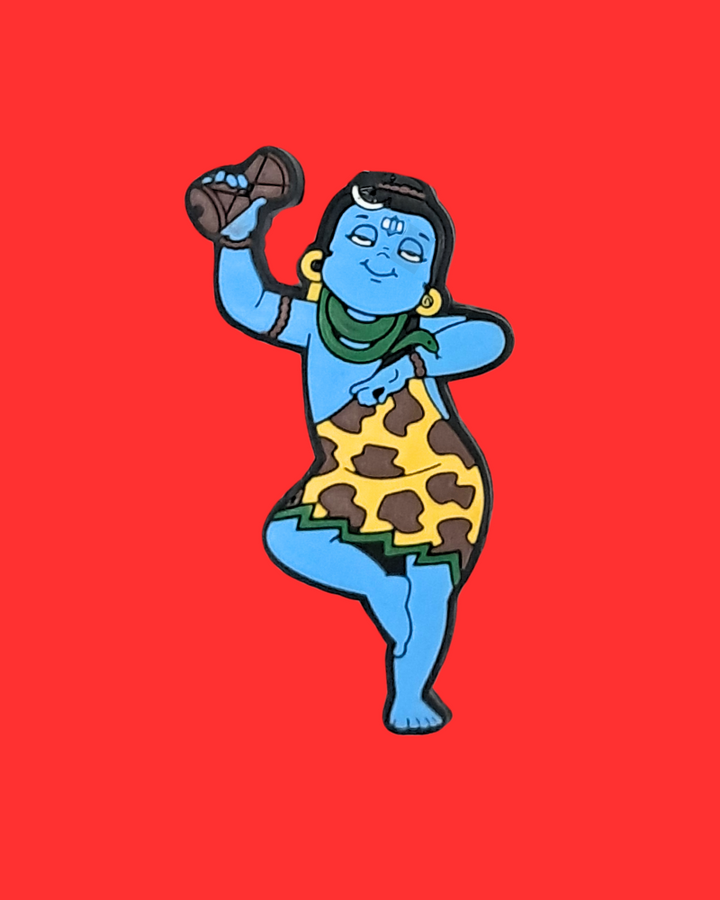 This funky keychain shows Little Shiva in a joyous dancing pose, complete with damaru and tiger skin attire. A fun take on the cosmic dancer, Nataraja, it's crafted from high-quality moulded rubber and makes a unique accessory for spiritual seekers and kids alike.