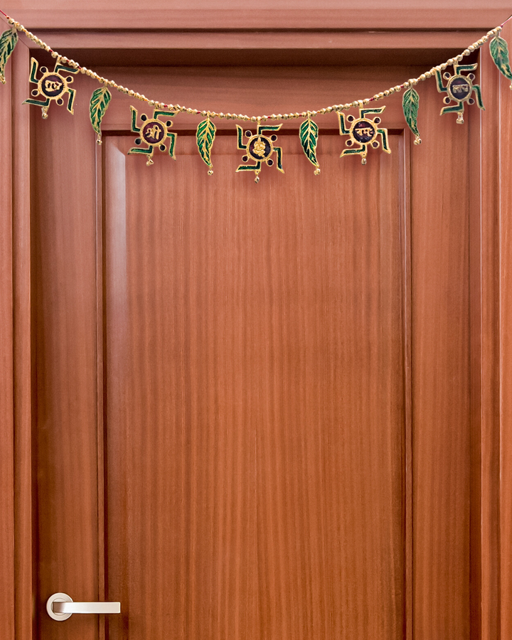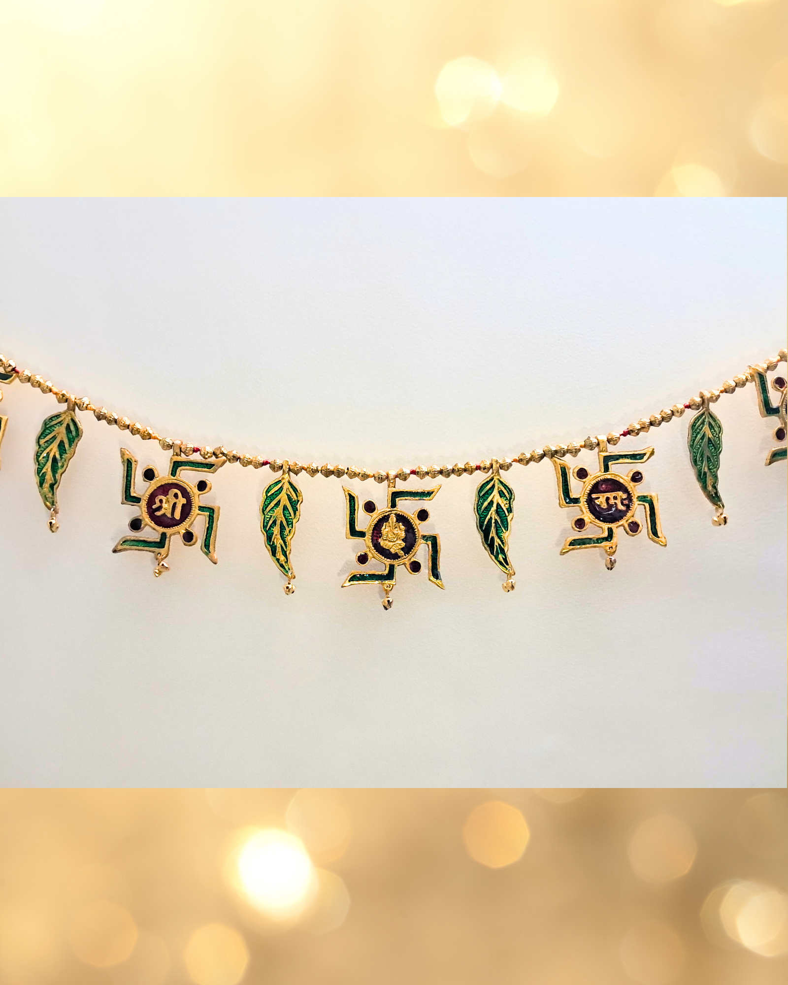 Handcrafted from durable metal with a rich gold-toned finish and green enamel detailing, this toran beautifully combines spirituality with fine craftsmanship. The Swastik symbols are interspersed with hanging leaf charms, adding movement, color, and elegance to your doorway décor.