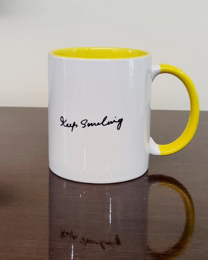 Start your day on a cheerful note with our “Keep Smiling” ceramic mug – a simple yet powerful reminder to embrace life with joy. One side features a bright yellow smiley face, radiating positivity, while the other side carries the handwritten quote “Keep Smiling” – an uplifting message inspired by the teachings of Swami Chinmayananda.