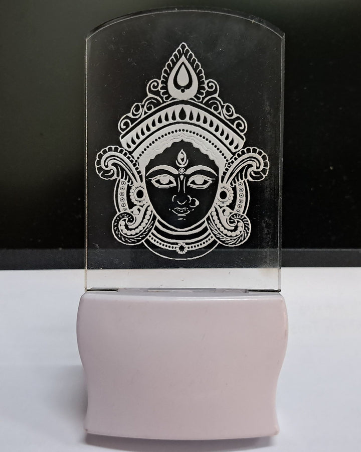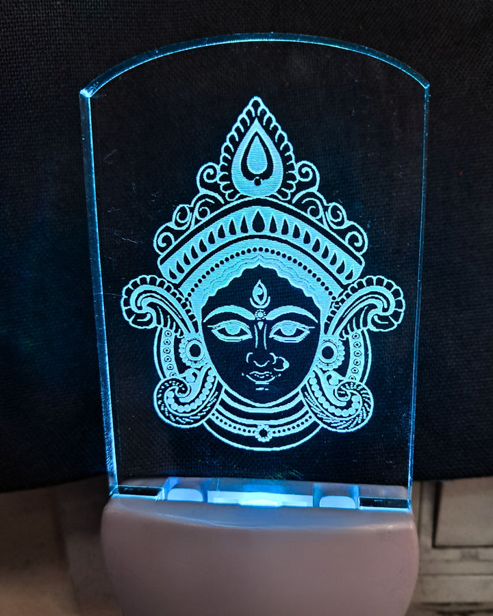 Invoke strength, protection, and divine grace with this elegant plug-in night light featuring an intricately engraved image of Goddess Durga. The soft, color-changing glow radiates warmth and serenity, making it perfect for bedrooms, prayer corners, or as a comforting night companion.