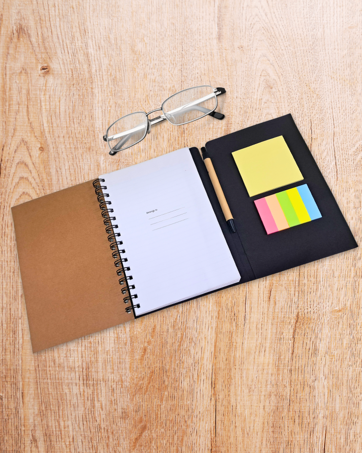 Inside, you’ll find high-quality ruled sheets for writing, colourful sticky notes for reminders and bookmarks, and a sleek eco-friendly pen—all neatly arranged to make your work or journaling experience seamless and inspiring. Whether used for school, office, or personal reflections, this notebook is your reliable companion for organised and mindful living.