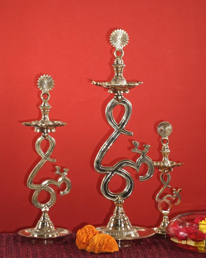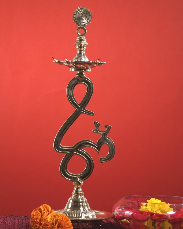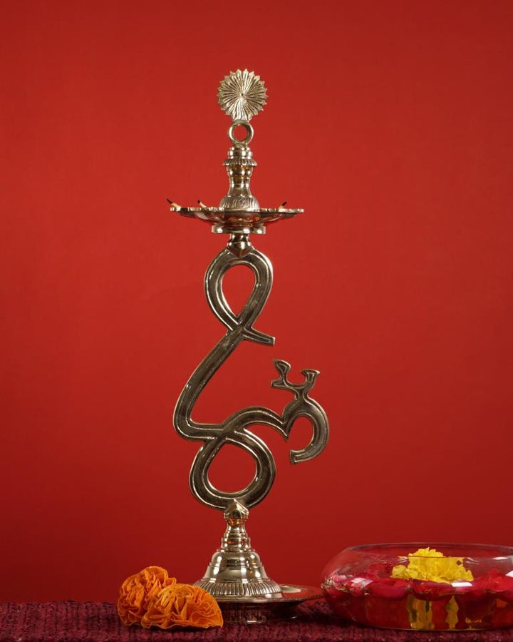 Design: Om-shaped sculpture with traditional five-wick diya holder