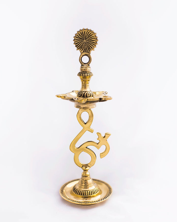 Gracefully sculpted from solid brass, our Om Lamp beautifully combines sacred symbolism with timeless tradition. The elegant form of ‘Om’ rises seamlessly from the sturdy base, culminating in a traditional diya platform designed to accommodate five wicks—each representing the five elements (earth, water, fire, air, and space) and divine illumination.