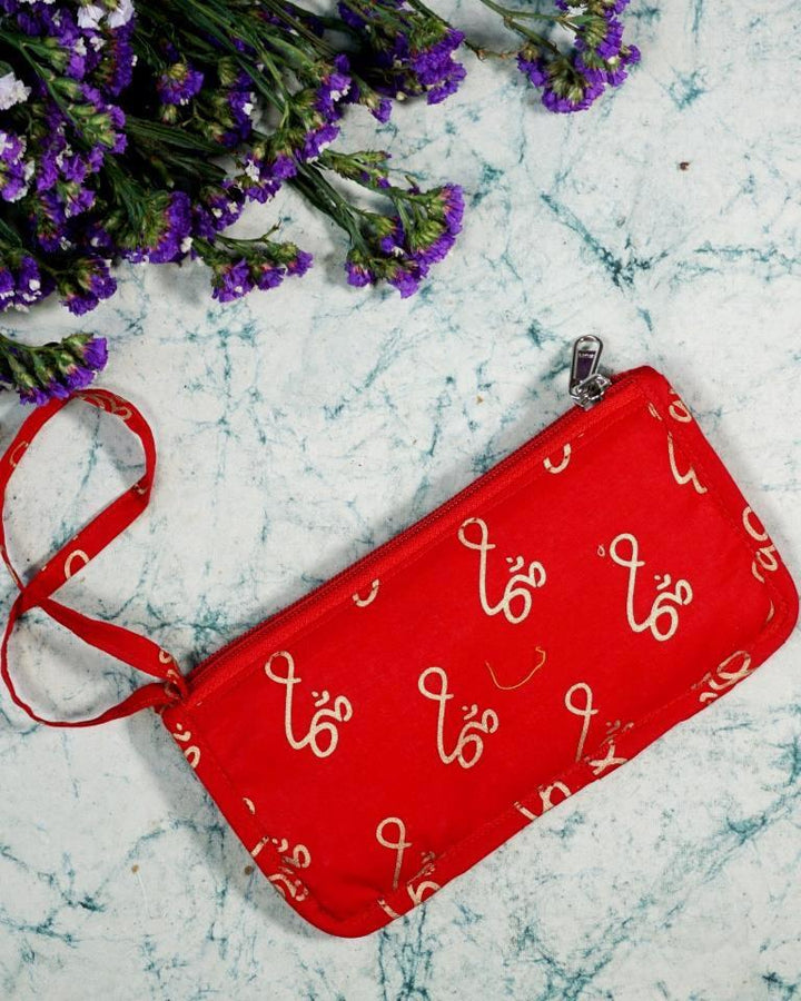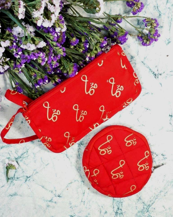A quilted rectangular pouch made of soft cotton which is printed with Swami Chinamayananda's signature Om. It has 2 pockets, one with a zip and the other with a button. So it can be used for carrying your mobile phone and even your glasses. It is very light and handy, perfect to slip into your carry on while traveling.