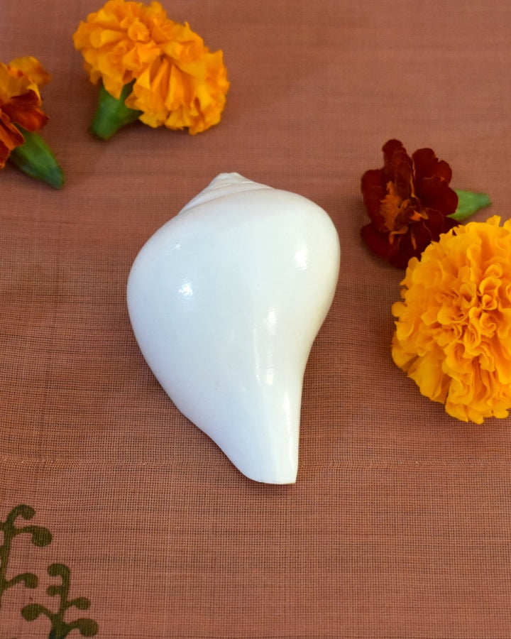There are conches or shankhs that are blown for the auspicious vibrations. And then there are those which are used for puja or worship. These are generally smaller than the blowing conches.