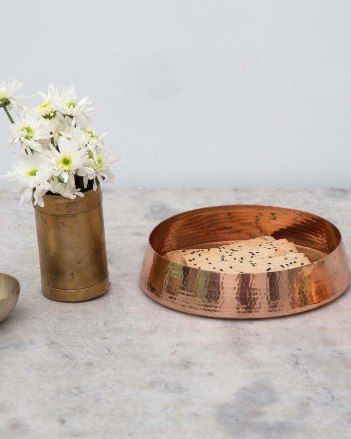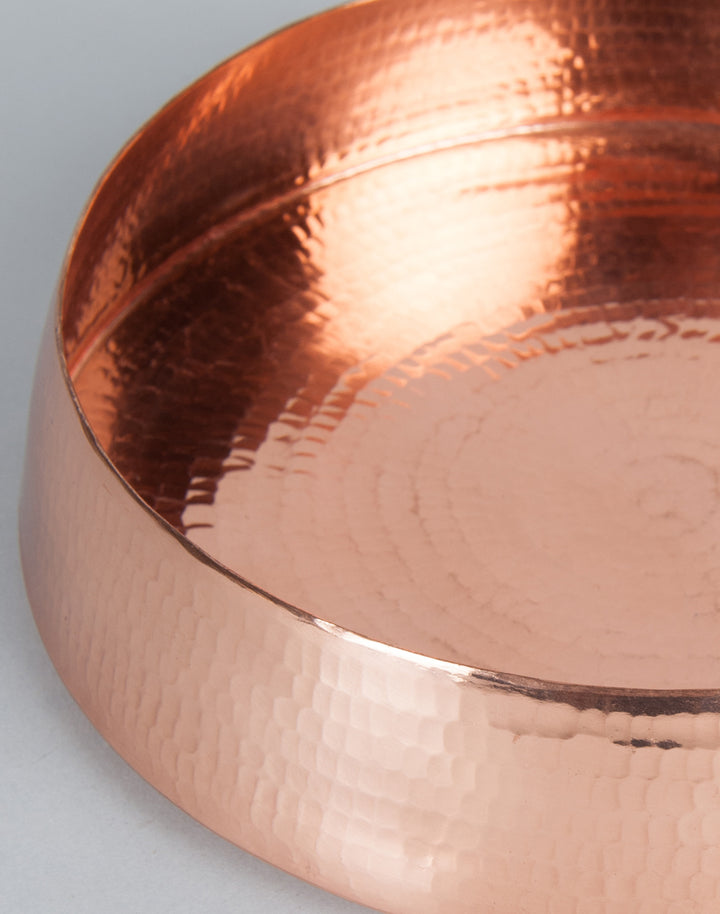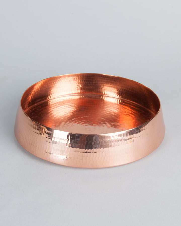 A handbeaten copper floater/bowl that can be used as a decorative bowl to float flowers or for serving dry stuff only. This product is of 99% purity. It should be hand washed with mild liquid soap. Wipe and dry immediately after washing. Never use abrasive or acidic content for cleaning. These products should be used for dry serving only.