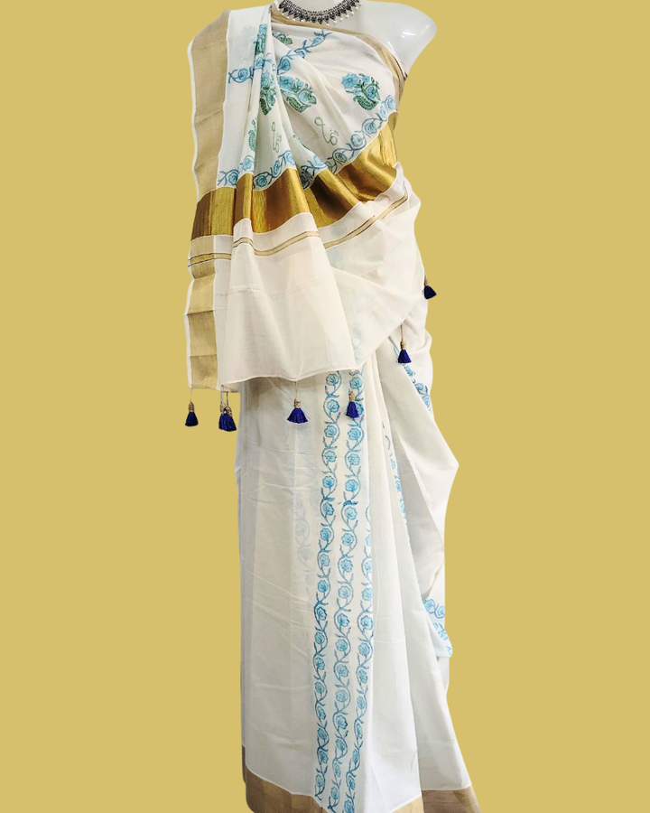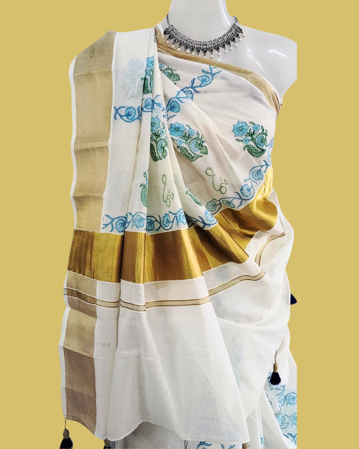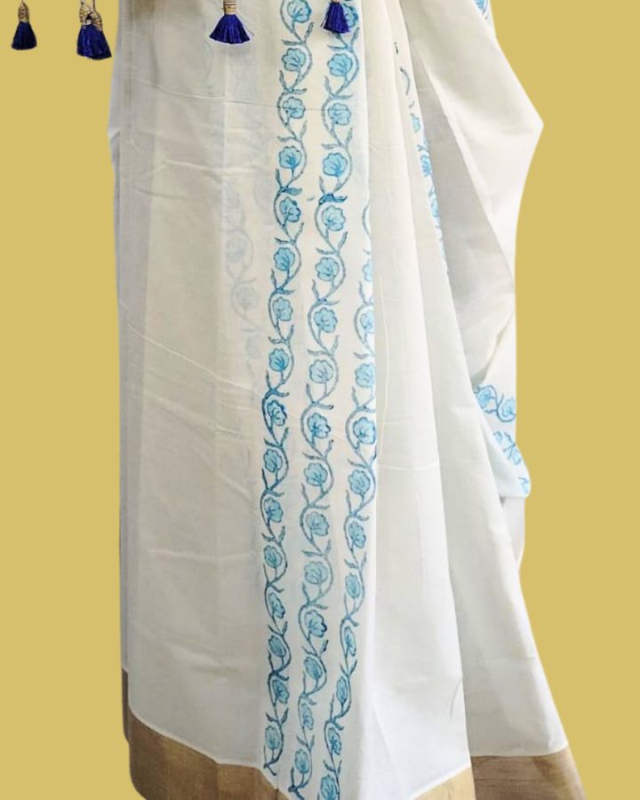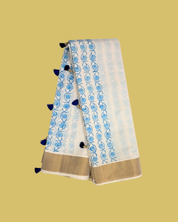 Saree: Kerala Cotton - Gold Zari Border with Light Blue Floral Print