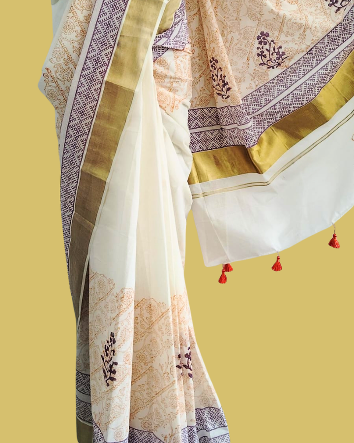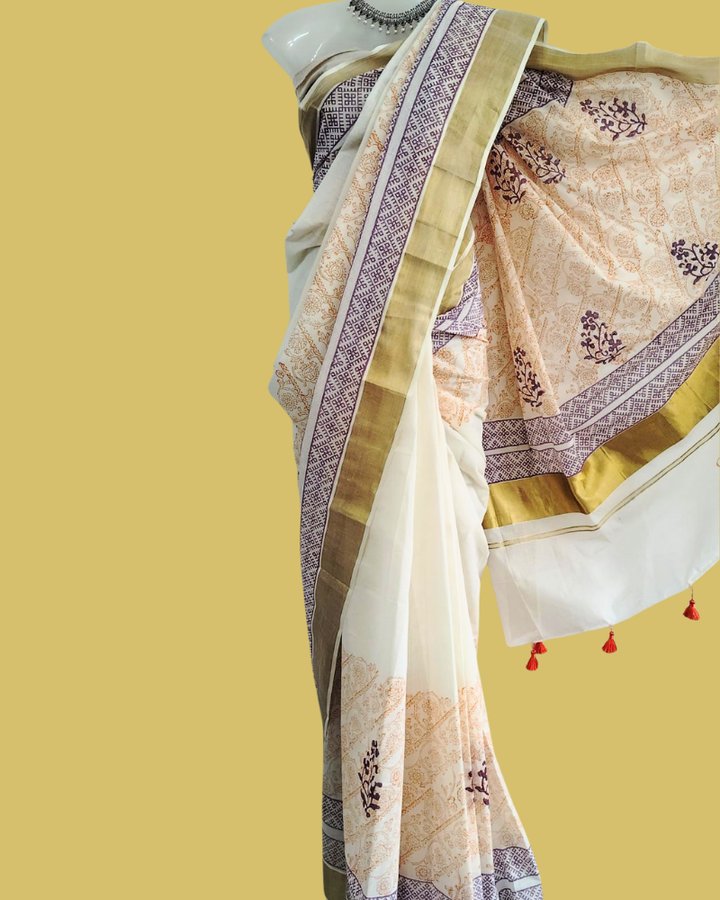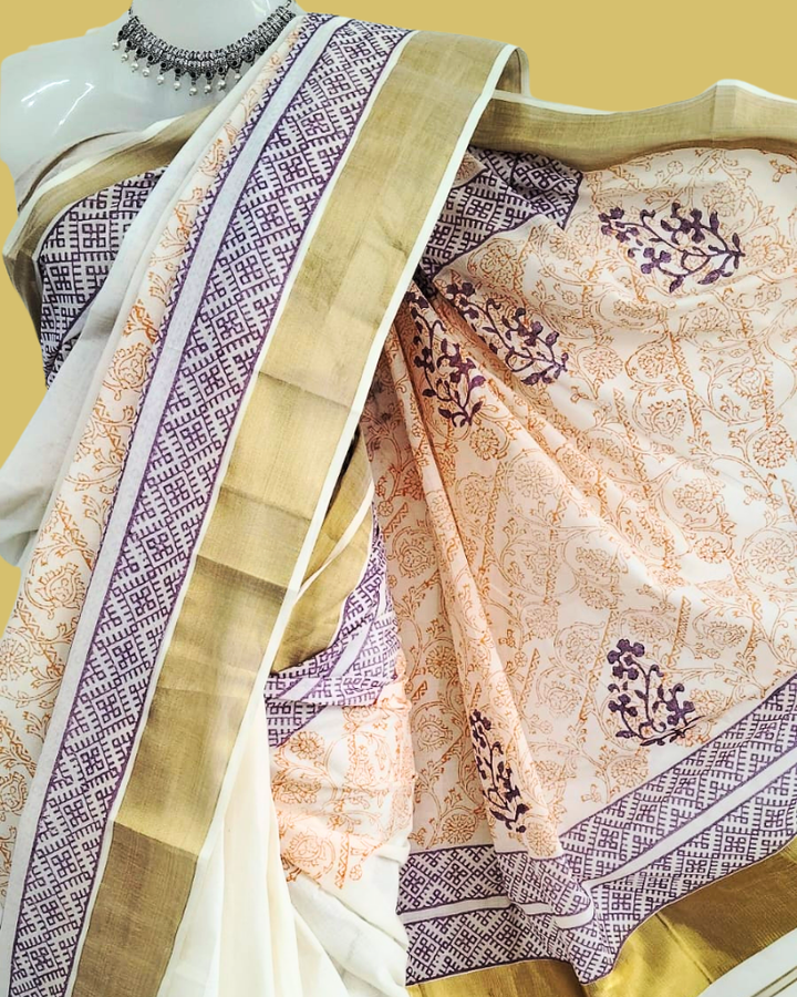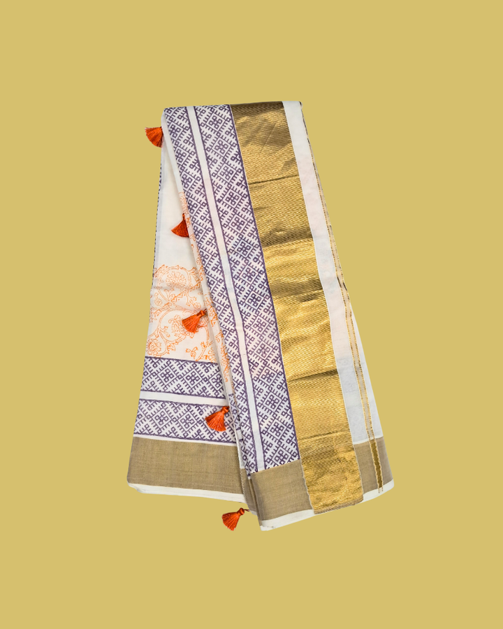 Saree: Kerala Cotton - Gold Zari Border with Orange & Lavender Print