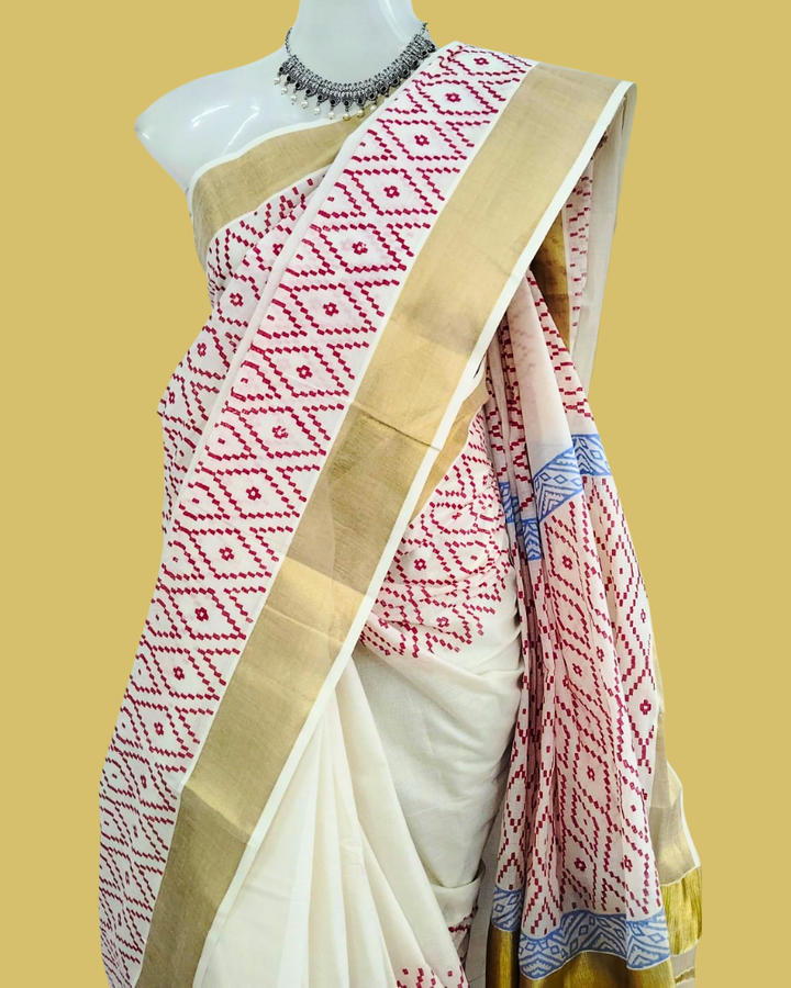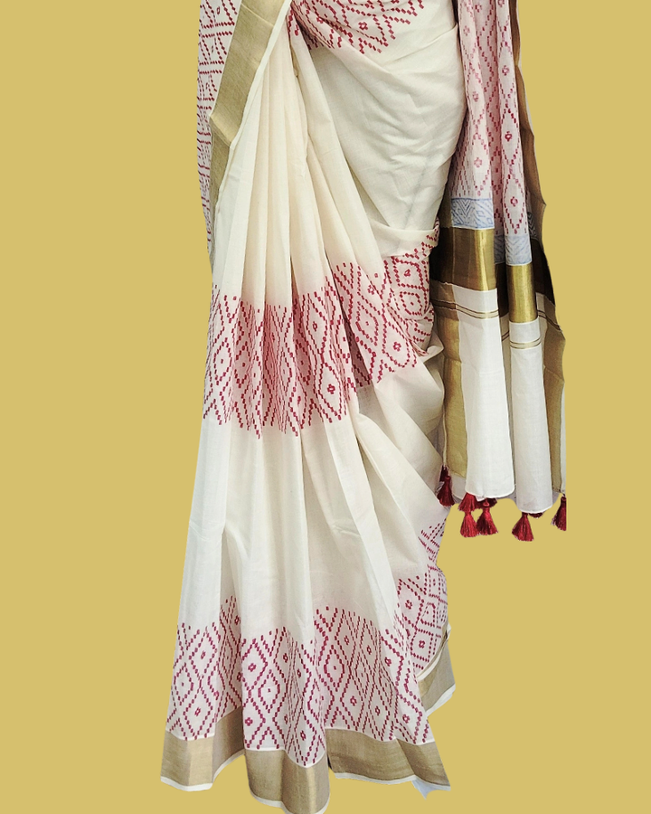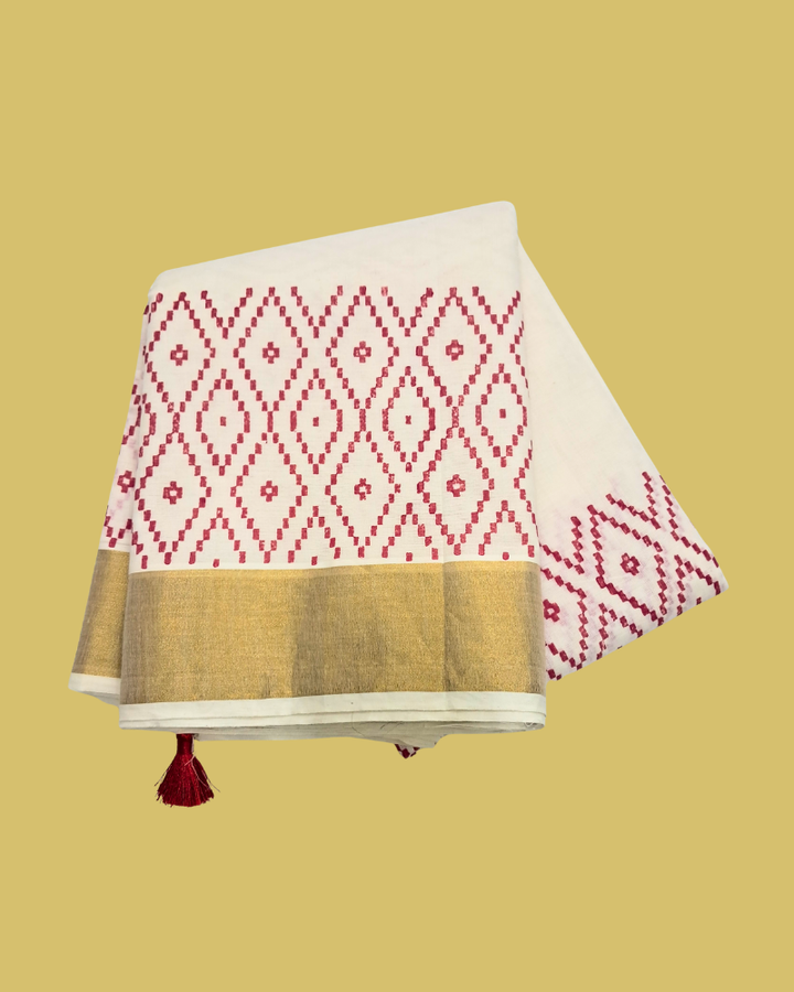 Saree: Kerala Cotton - Gold Zari Border with Red Geometric Print
