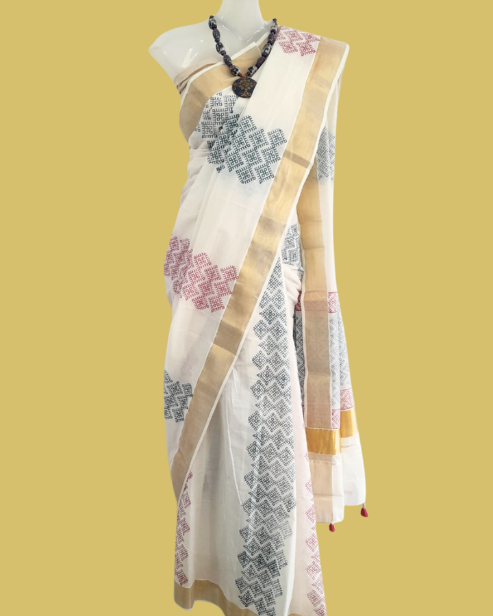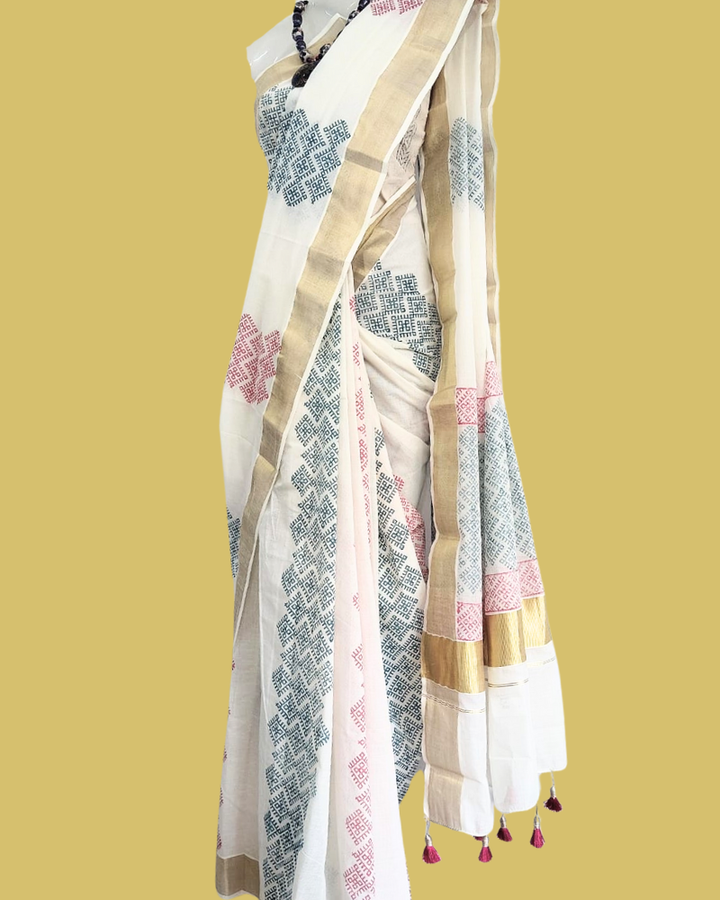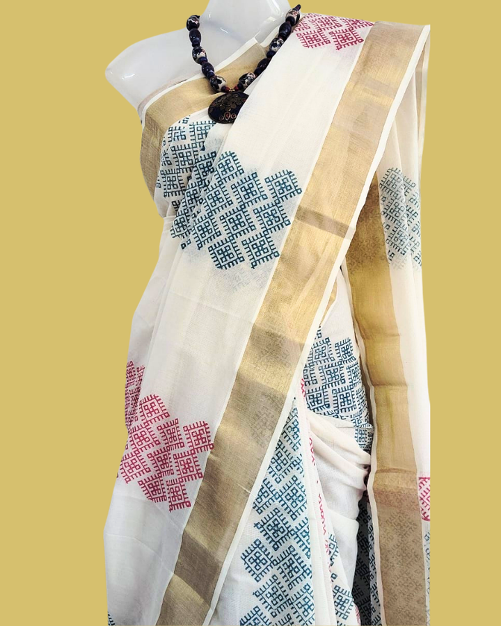 Saree: Kerala Cotton - Gold Zari Border with Red & Green Print