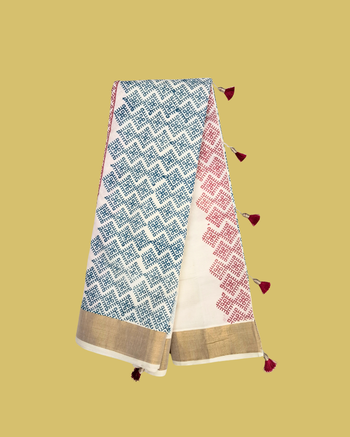 These sarees are all about the little touches. A gentle off-white canvas, brought to life with gold zari weaves and hand block printed designs in earthy reds, cool blues, fresh greens, and warm oranges. Each motif – from floral patterns and vines to our signature Om – is stamped by hand, reflecting the quiet magic of artisan craftsmanship. And of course, the tassels on the pallu bring that perfect finishing flourish – a little playful, a little poetic.