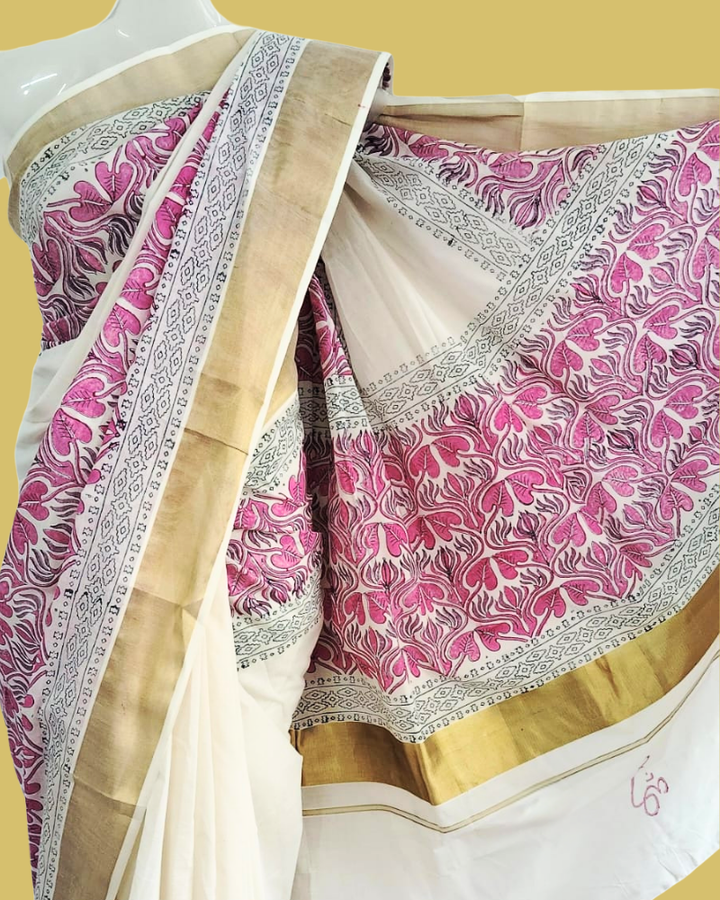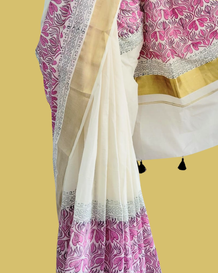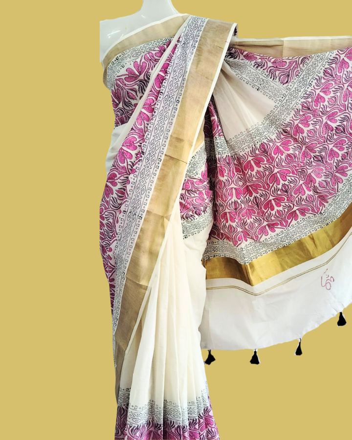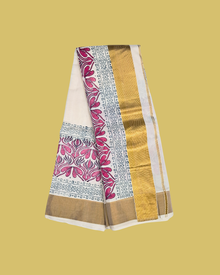 Saree: Kerala Cotton - Gold Zari Border with Pink & Green Print