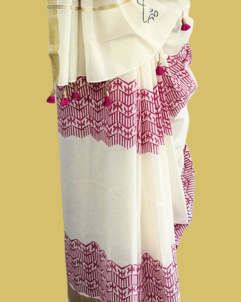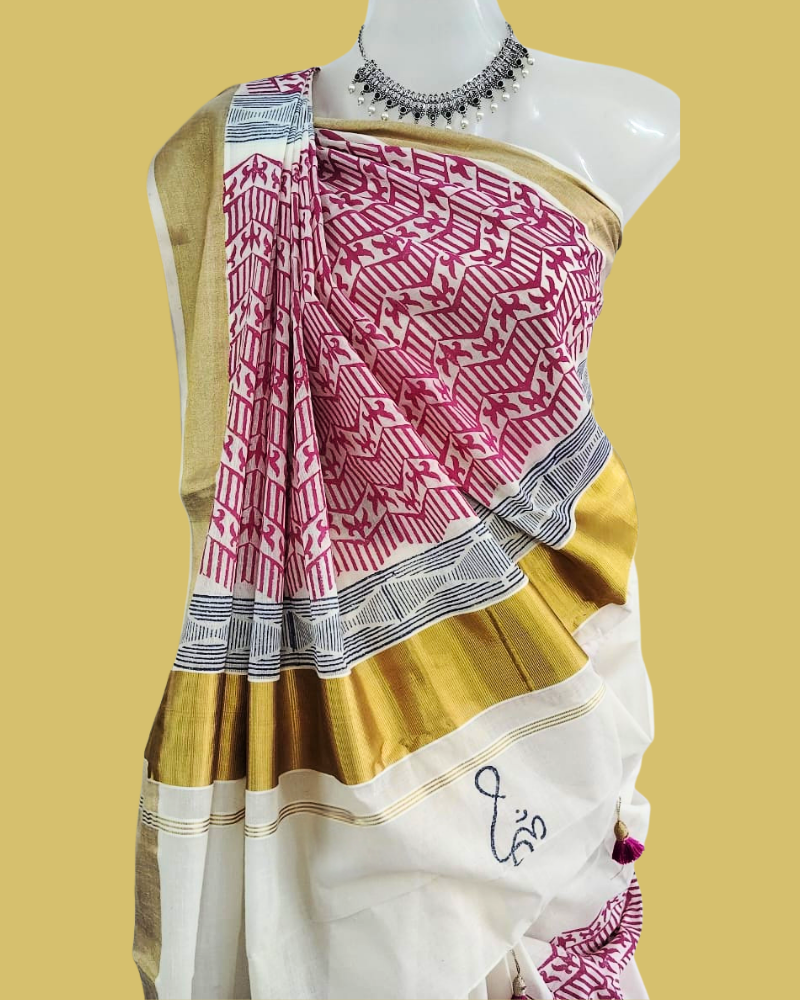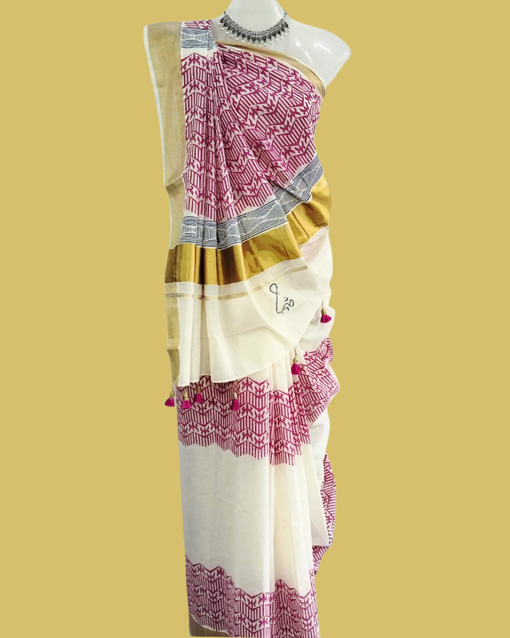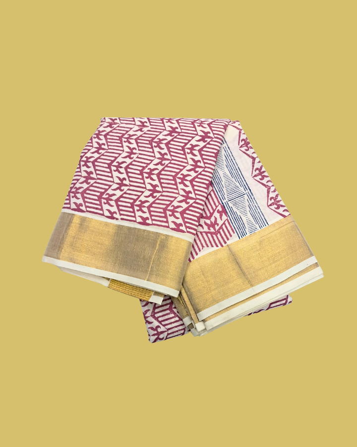 Saree: Kerala Cotton - Gold Zari Border with Pink & Green Print