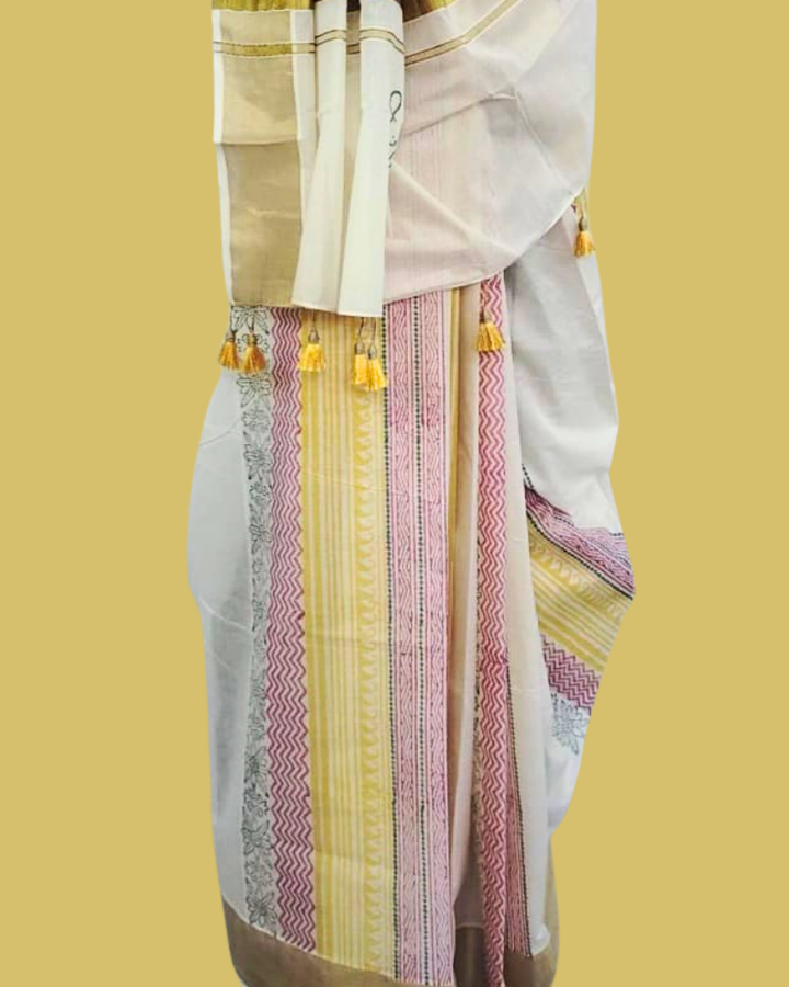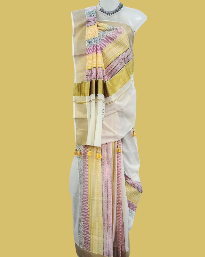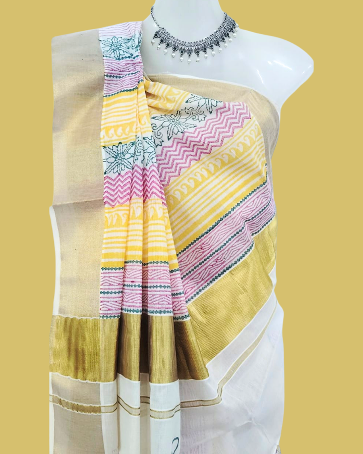 Saree: Kerala Cotton - Gold Zari Border with Red, Green & Orange Print