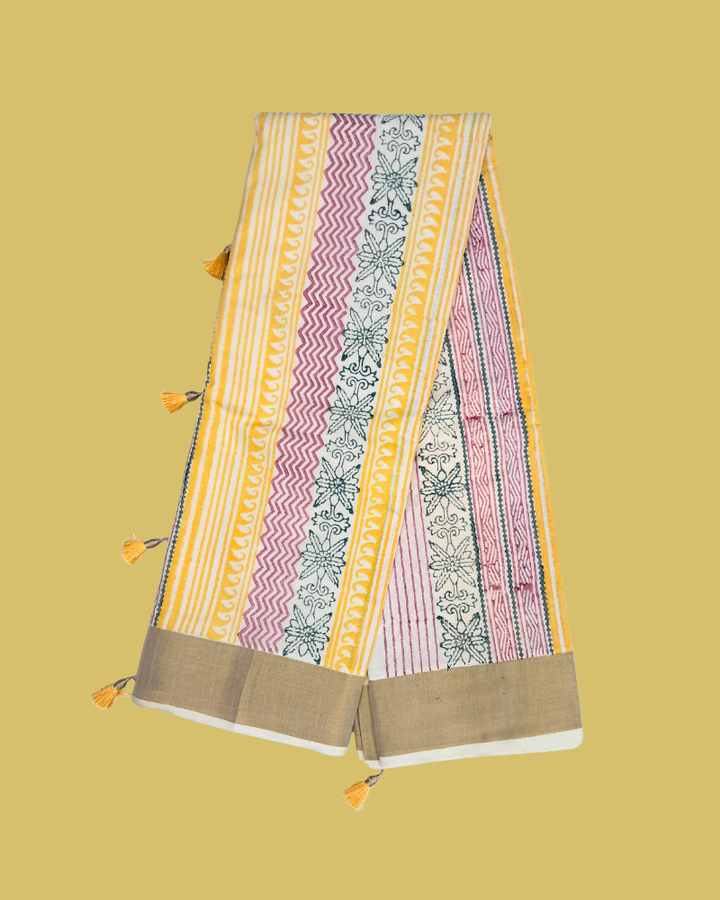 These sarees are all about the little touches. A gentle off-white canvas, brought to life with gold zari weaves and hand block printed designs in earthy reds, cool blues, fresh greens, and warm oranges. Each motif – from floral patterns and vines to our signature Om – is stamped by hand, reflecting the quiet magic of artisan craftsmanship. And of course, the tassels on the pallu bring that perfect finishing flourish – a little playful, a little poetic.
