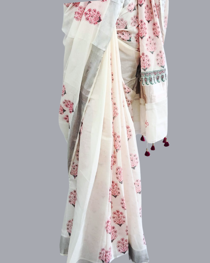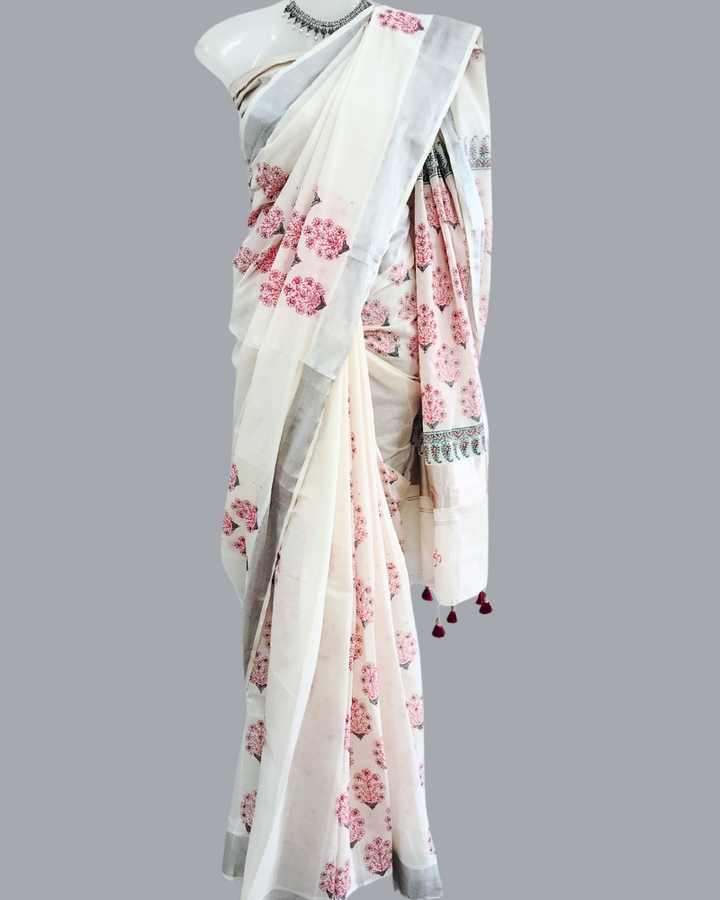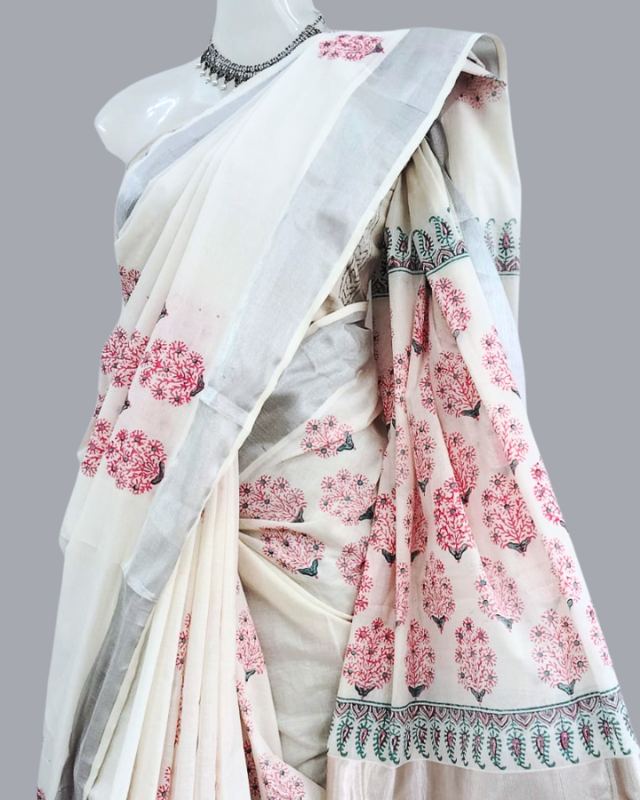 Saree: Kerala Cotton - Silver Zari Border with Red Floral Print