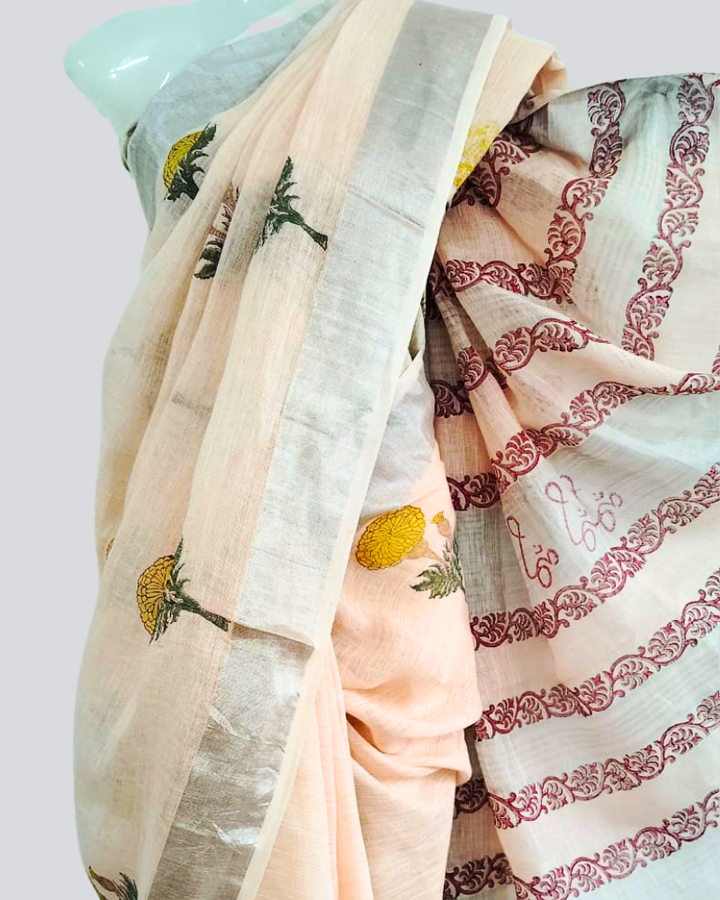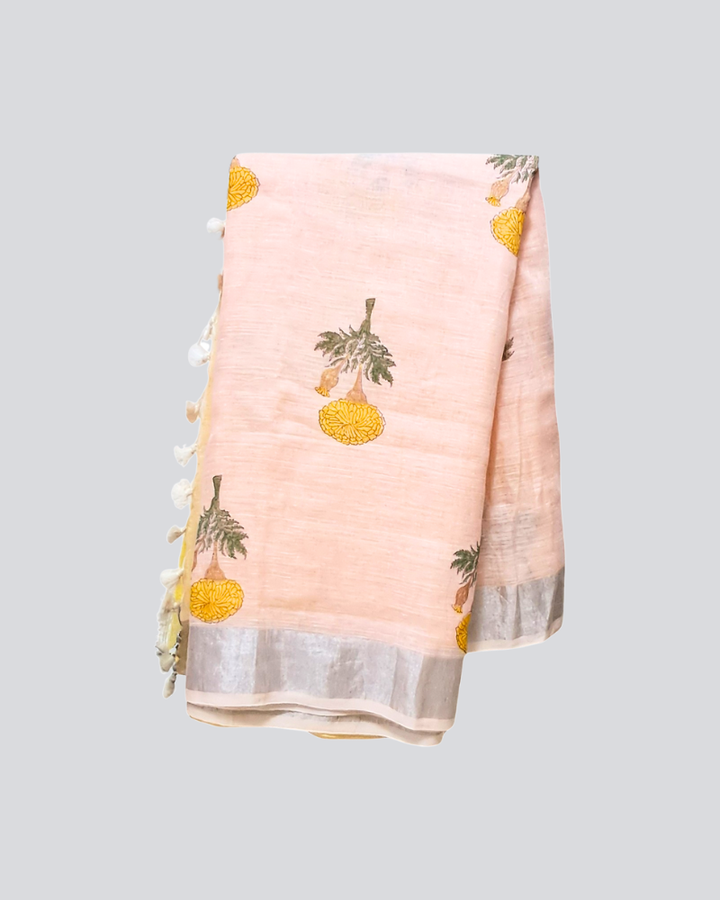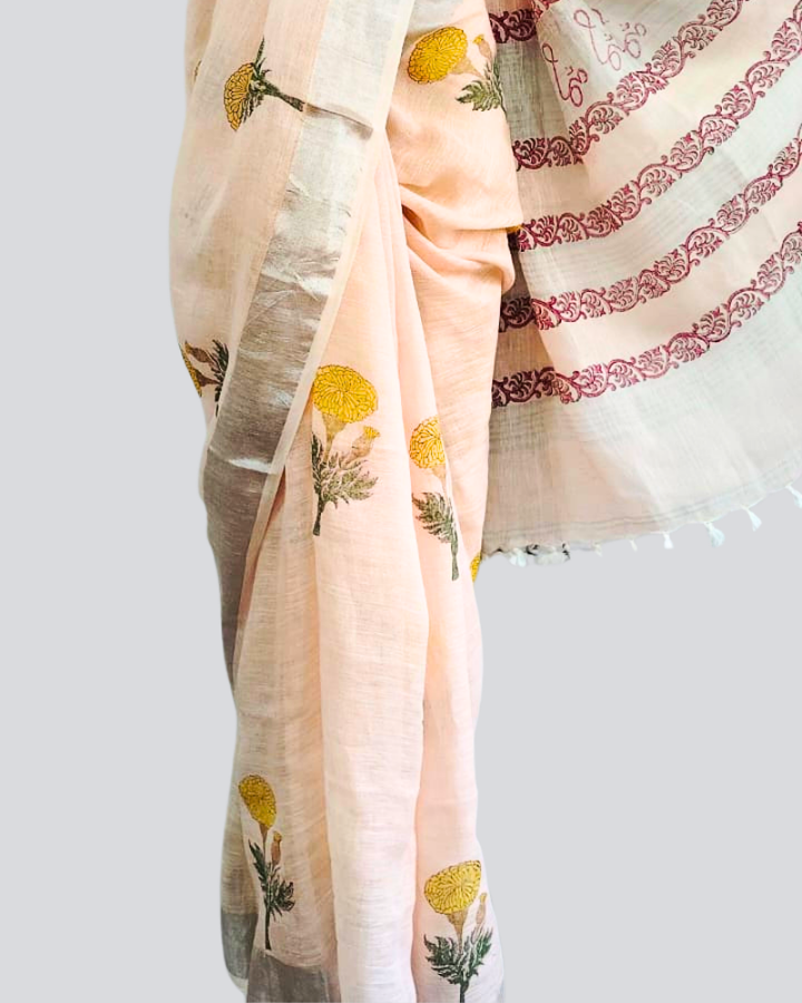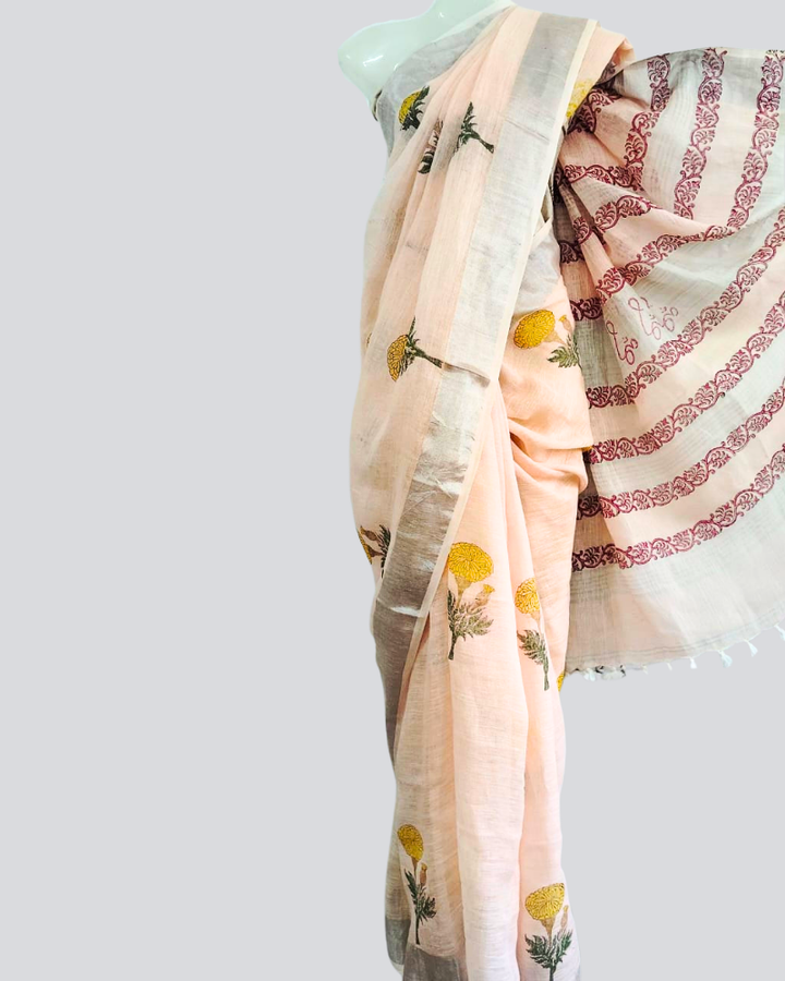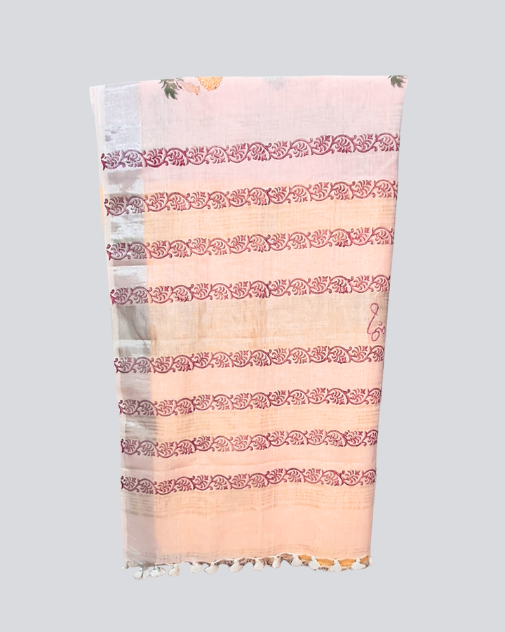 Handwoven Linen Saree with Hand Block Print & Silver Border - Ligth Peach