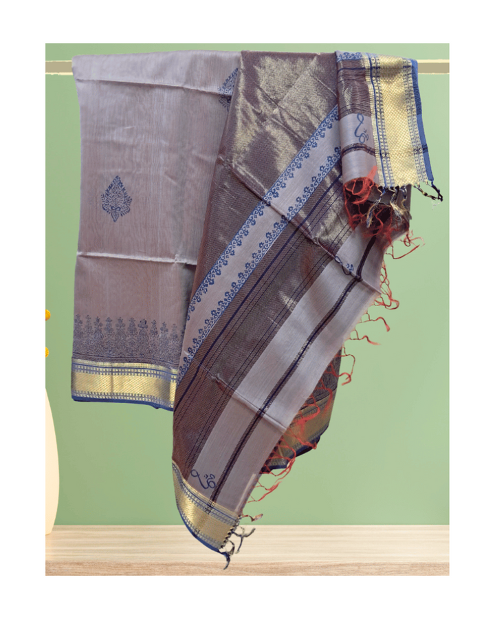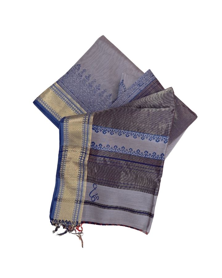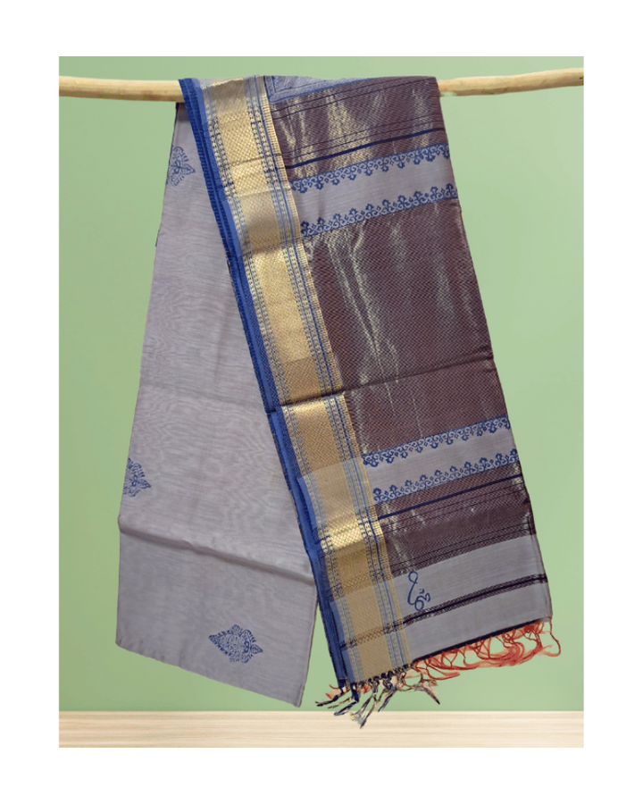 Saree: Maheshwari Silk-Cotton Big Zari Border - Grey & Blue