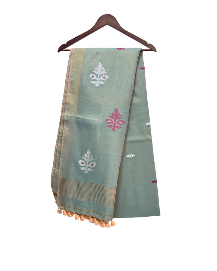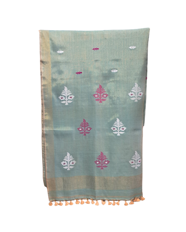 Handwoven Tissue Linen Jamdani Saree - Sea Green