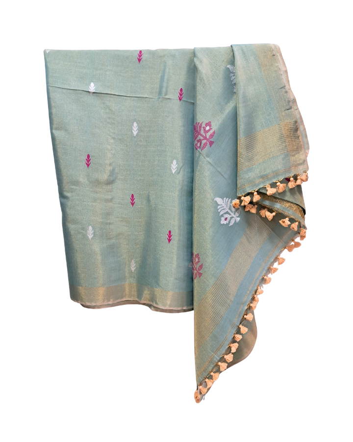 Woven in the finest tissue linen, the saree features a luminous sea-green canvas decorated with intricate Jamdani motifs. Its subtle shimmer captures the light beautifully, while the silver border enhances its festive appeal. Lightweight and breathable, it ensures ease of drape and all-day comfort.