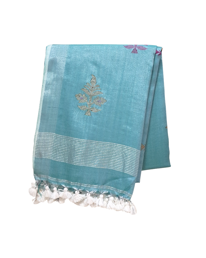 Handwoven Tissue Linen Jamdani Saree - Sky Blue