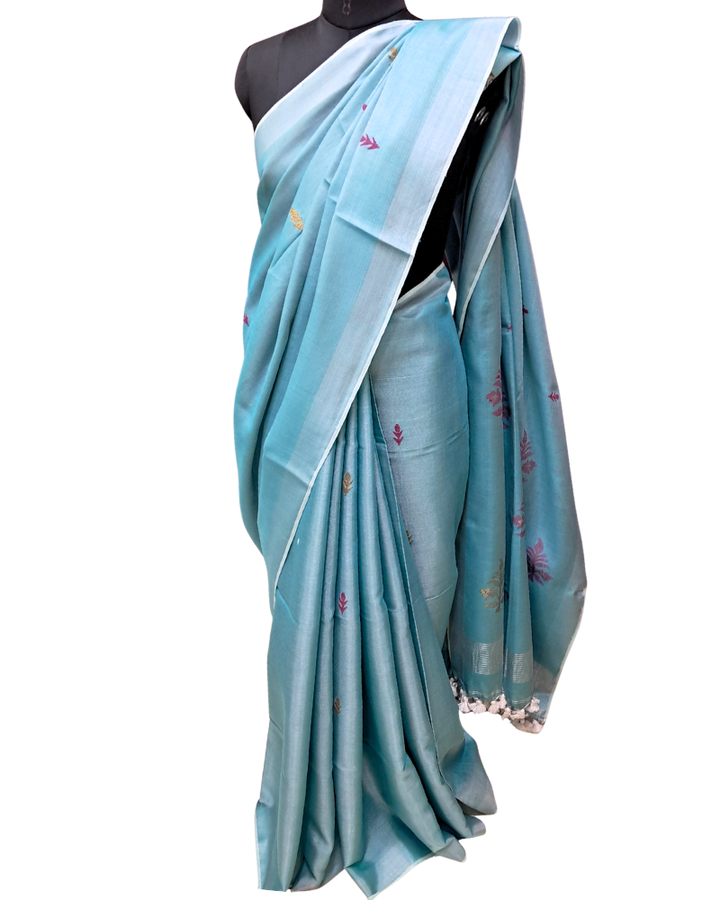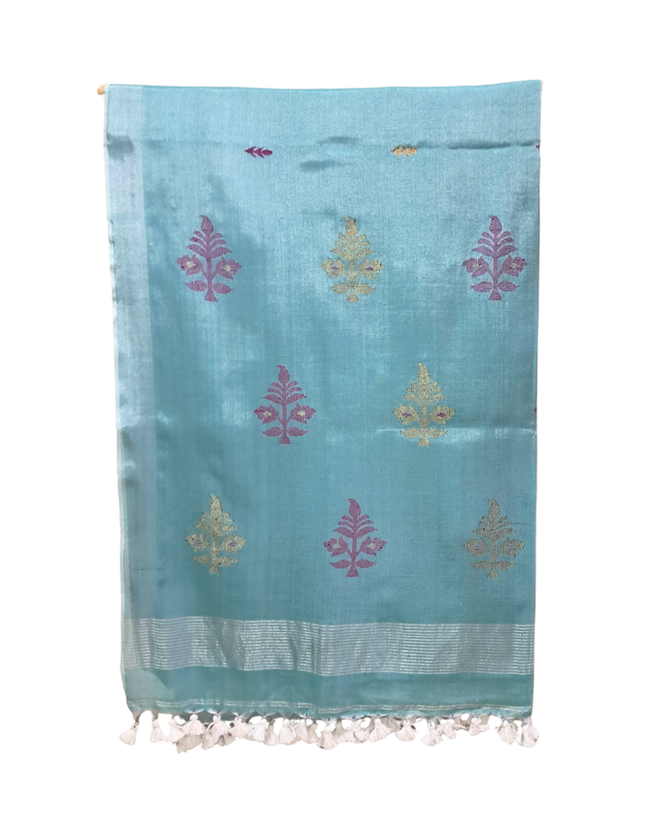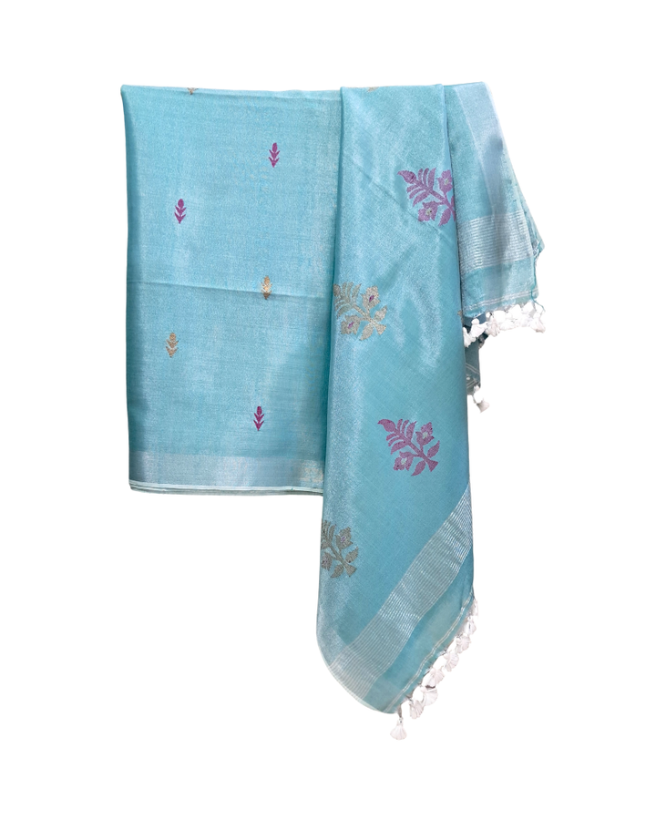 The sky blue base is adorned with delicate Jamdani motifs, framed with a shimmering silver border. Its pallu features silver stripes, adding a festive sparkle that makes the saree stand out beautifully. Crafted from soft tissue linen, it feels feather-light and airy, ensuring comfort all day long.