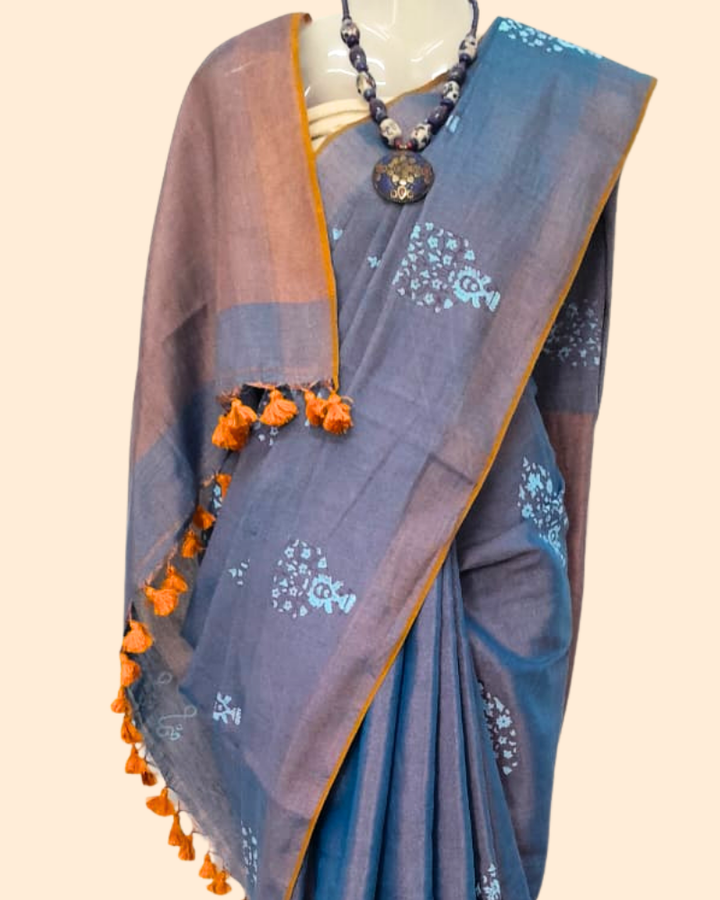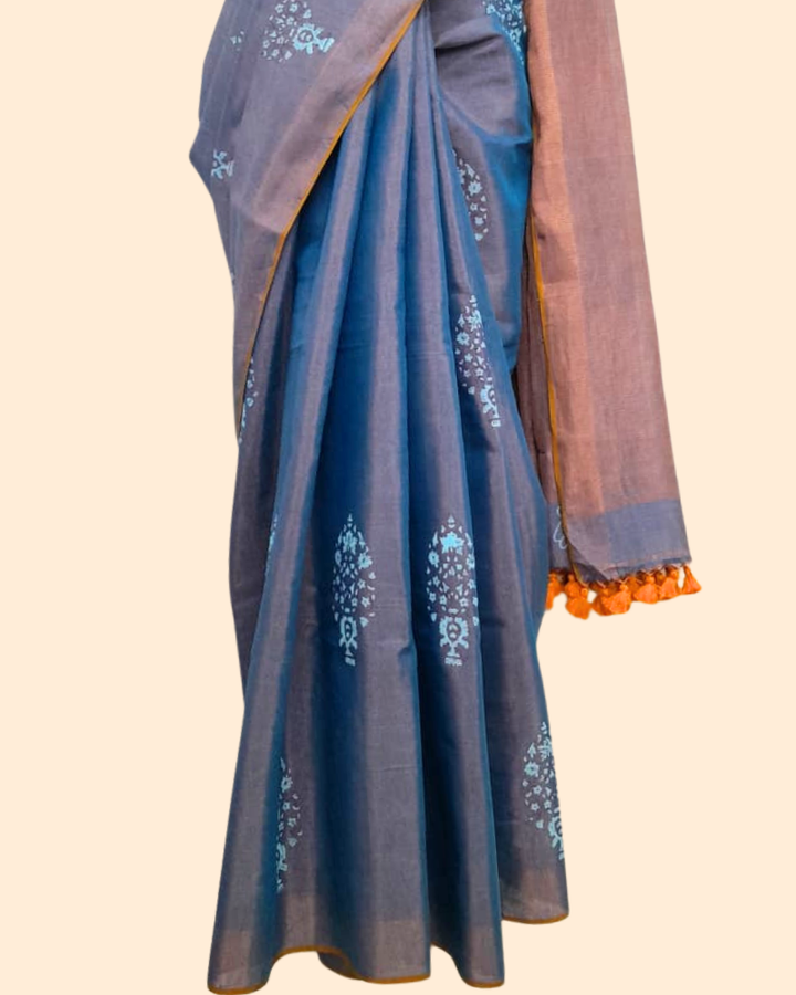 ✨ A one-of-a-kind slate blue tissue linen saree with hand block prints – crafted for festive elegance.