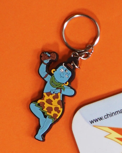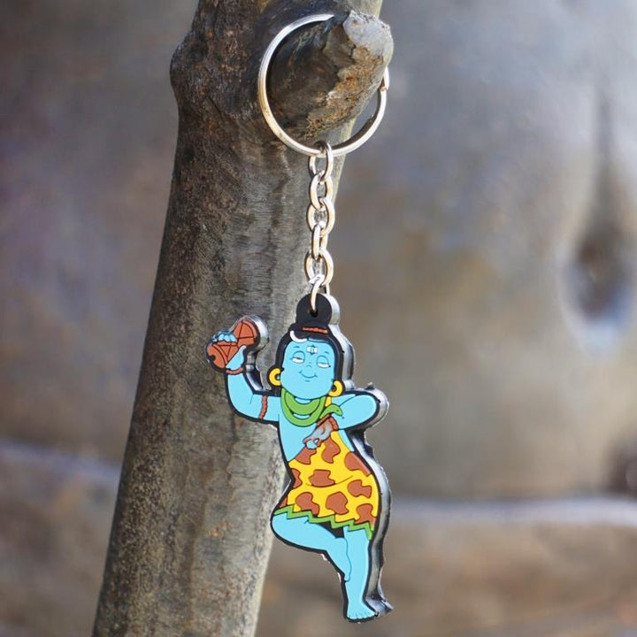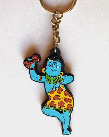 This funky keychain shows Little Shiva in a joyous dancing pose, complete with damaru and tiger skin attire. A fun take on the cosmic dancer, Nataraja, it's crafted from high-quality moulded rubber and makes a unique accessory for spiritual seekers and kids alike.