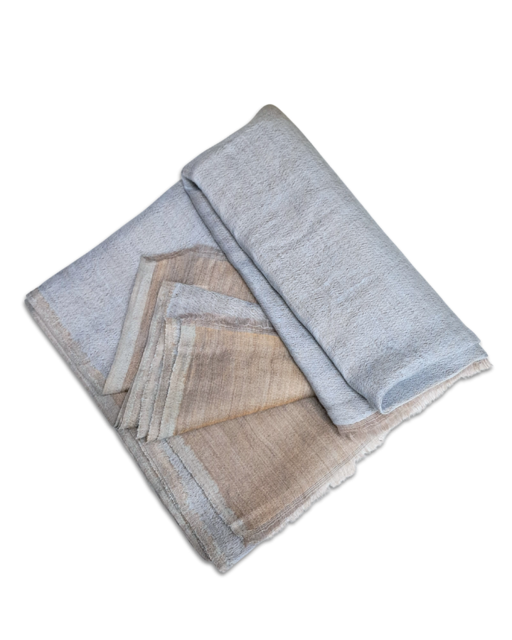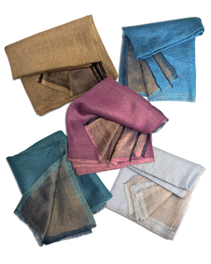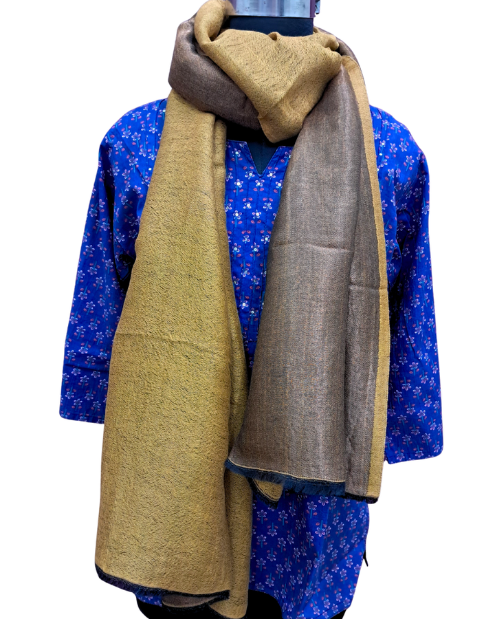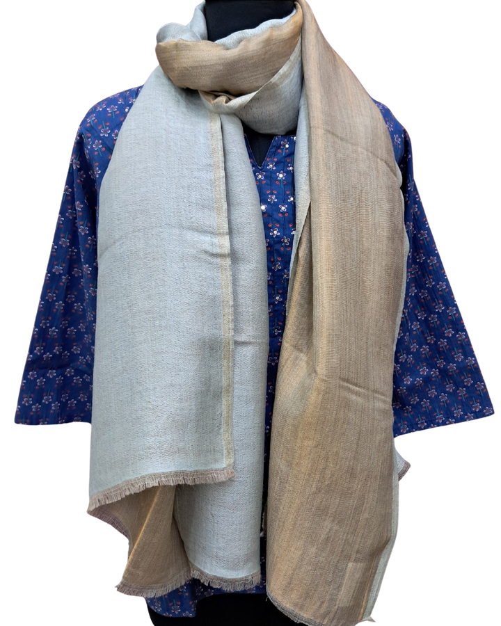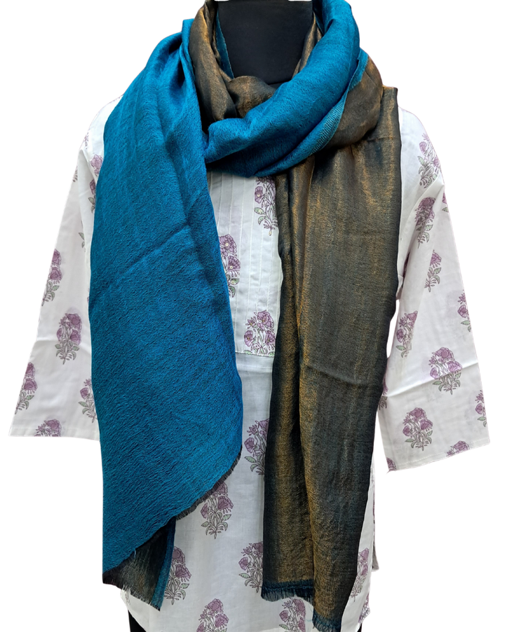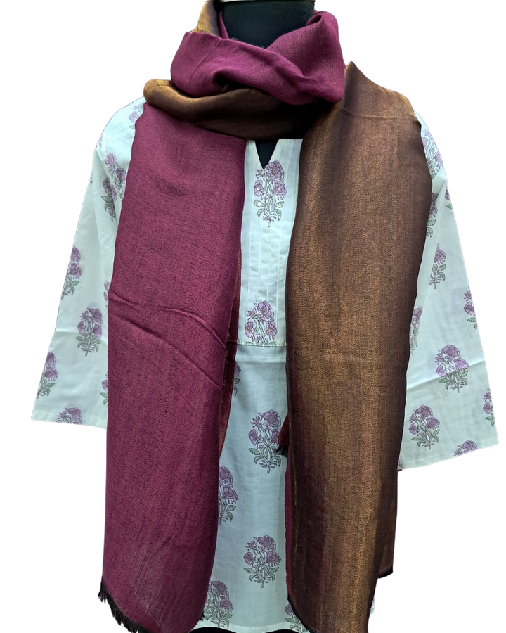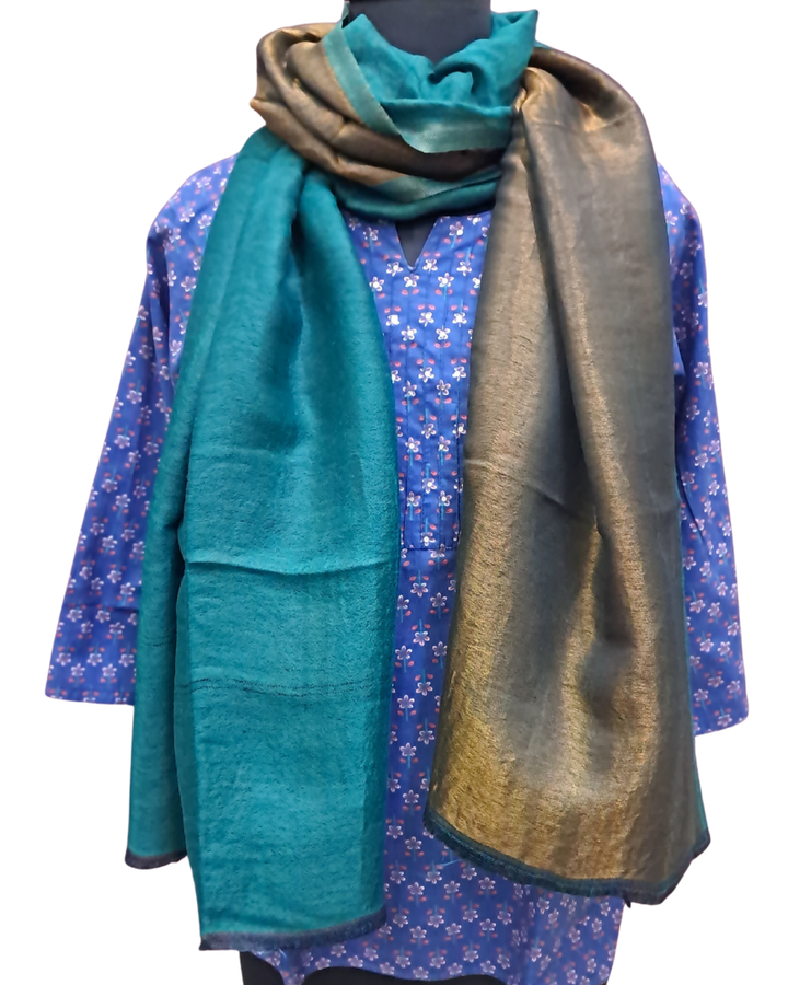 Celebrate the season of light with our Reversible Fine Wool Stole, a luxurious blend of wool and silk designed to keep you warm while looking effortlessly elegant. Each stole features a dual design – a rich solid shade on one side and a subtle zari weave on the other, offering two versatile looks in a single piece. The delicate zari threads add just the right touch of festive sparkle, making it ideal for weddings, Diwali parties, pujas, and evening gatherings.