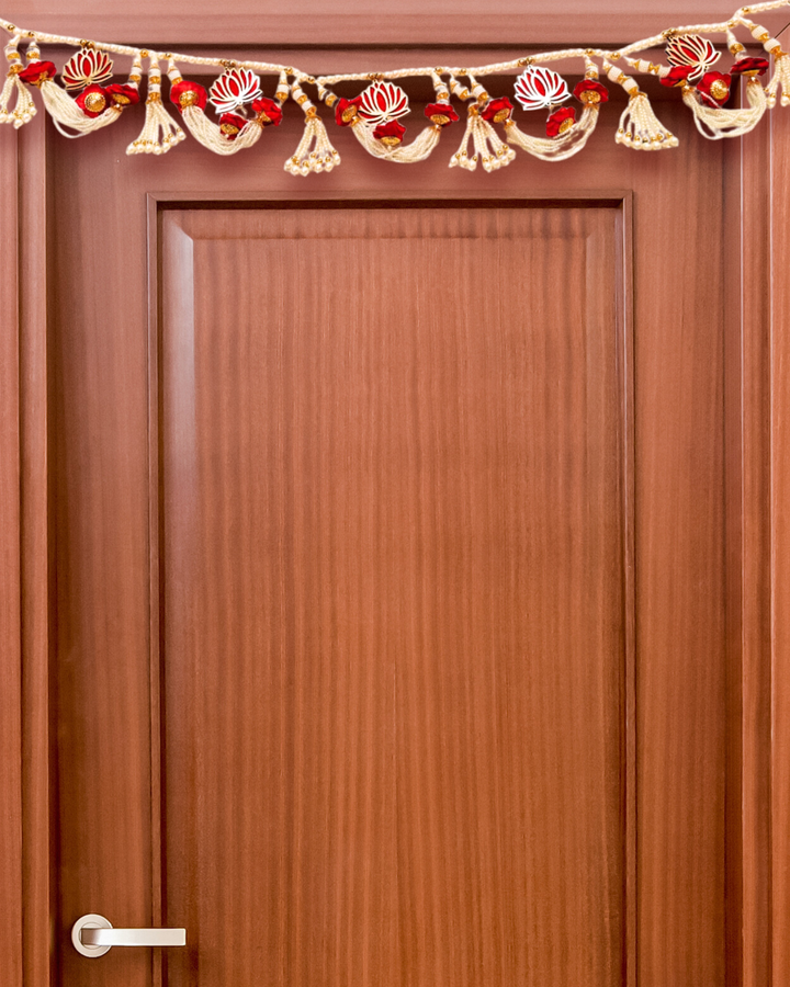 Featuring intricately cut lotus motifs made from durable MDF, this toran is accented with ivory bead strings, decorative tassels, and red embellishments that lend a soft, elegant glow to your doorway or pooja space.